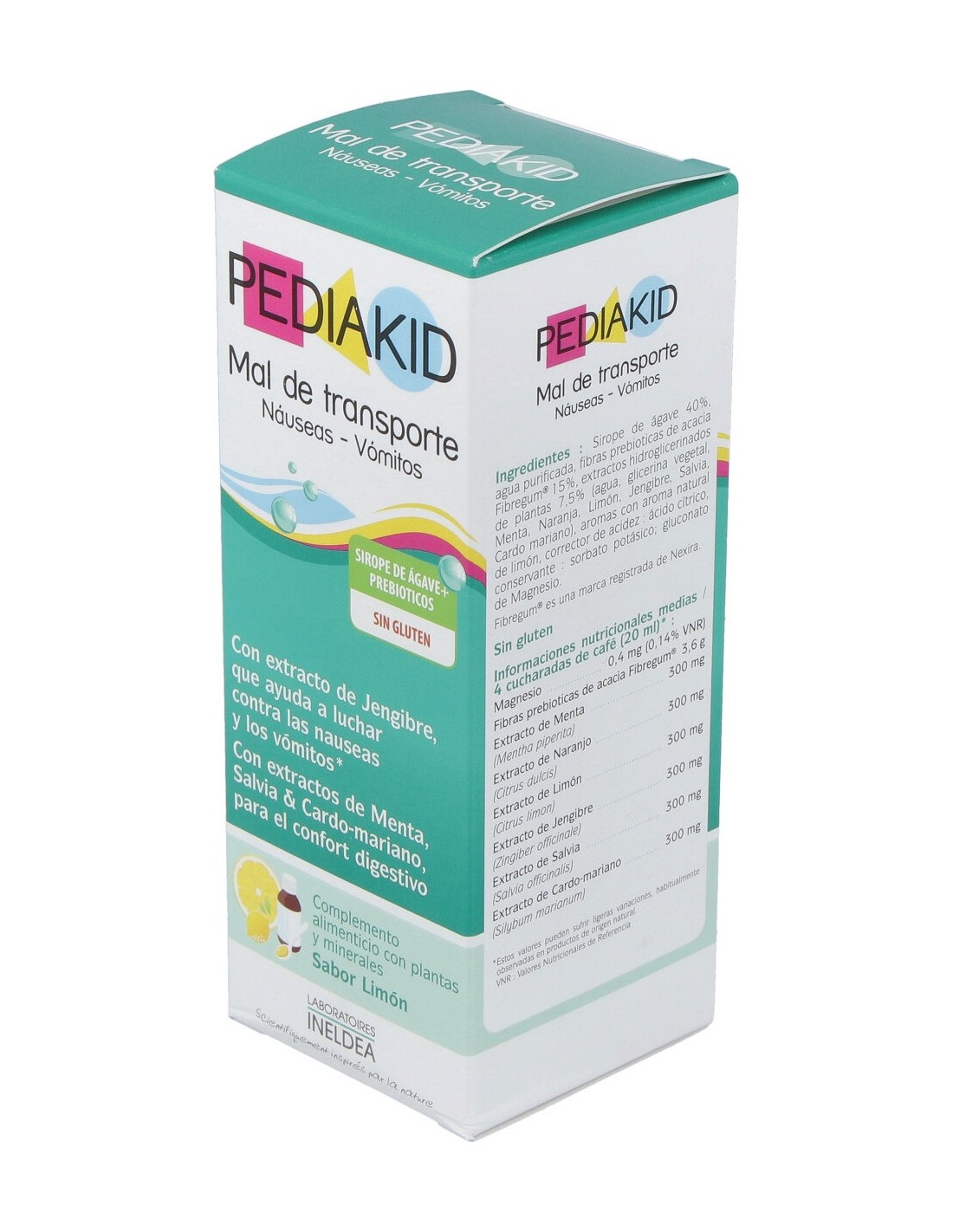 Jarabe de ágave 40%, agua purificada, 15% fibra de acacia, extracto vegetal 7,5%(agua, glicerina vegetal, menta, naranja, limón, jengibre, salvia, cardo marie) Limón, regulador de la acidez: ácido cítrico, conservante: sorbato de potasio, gluconato de magnesio.