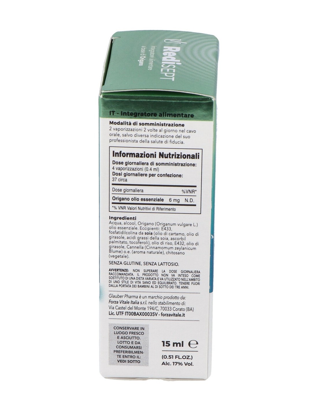 Agua, alcohol, Orégano (Origanum vulgare L.) aceite esencial. Excipientes: E433, fosfatidilcolina de soja (aceite de cártamo, aceite de girasol, ácidos grasos de soja, palmitato de ascorbilo, tocoferoles), aceite de arroz, E432, aceite de girasol, Canela (Cinnamomum zeylanicum Blume.) aceite esencial, quitosano (vegetal).