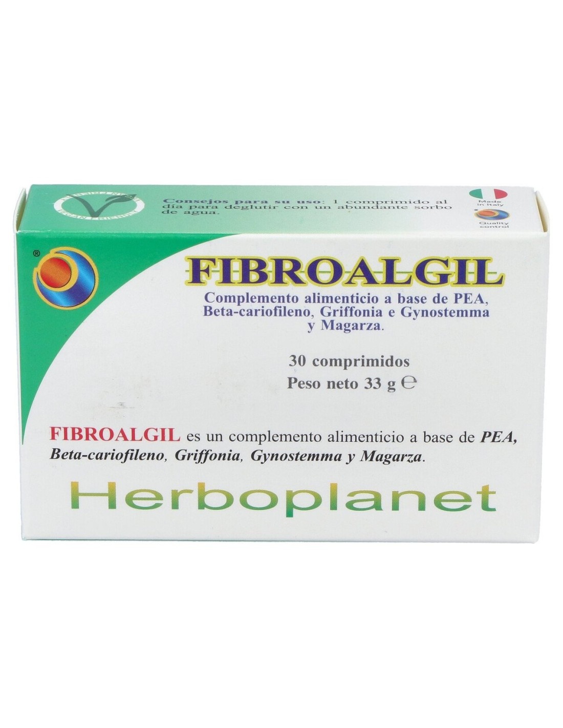 PEA (Palmitoiletanolamide) 300 mg. REPHYLL®: Pimienta negra extracto seco titulado 6% en Beta-cariofileno (Piper nigrum L. aceite, Lecitina de girasol, almidón modificado, Cúrcuma longa L. rizoma extr. acuoso) 300 mg (aporte en Beta Cariofileno 18 mg). Griffonia semillas extracto seco (Griffonia Simplicifolia (DC.) Baill.) titulado al 20% en 5-Hidroxitriptófano 250 mg (aporte en 5-Hidroxitriptófano 50 mg). Agente de carga: celulosa microcristalina. Gynostemma hierba extracto seco (Gynostemma pentaphyllum Thunb makino) titulada 80% en Gipenósidos 100 mg (aporte en Gipenósidos 80 mg). Agentes antiaglomerantes: bióxido de silicio, sales de magnesio de los ácidos grasos. Magarza sumidades floridas extracto seco (Tanacetum parthenium (L) Sch. Bip.) 2 mg.