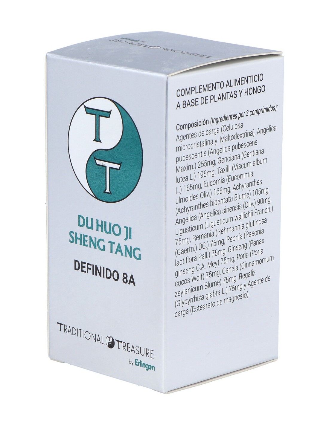 Agentes de carga (Celulosa microcristalina y Maltodextrina), Angelica pubescentis (Angelica pubescens Maxim.) 255 mg, Genciana (Gentiana lutea L.) 195 mg, Taxilli (Viscum album L.) 165 mg, Eucomia (Eucommia ulmoides Oliv.) 165 mg, Achyranthes (Achyranthes bidentata Blume) 105 mg, Angelica (Angelica sinensis (Oliv.) 90 mg, Ligusticum (Ligusticum wallichii Franch.) 75 mg, Remania (Rehmannia glutinosa (Gaertn.) DC.) 75 mg, Peonía (Paeonia lactiflora Pall.) 75 mg, Ginseng (Panax ginseng C.A. Mey) 75 mg, Poria (Poria cocos Wolf) 75 mg, Canela (Cinnamomum zeylanicum Blume) 75 mg, Regaliz (Glycyrrhiza glabra L.) 75 mg y Agente de carga (Estearato de magnesio).