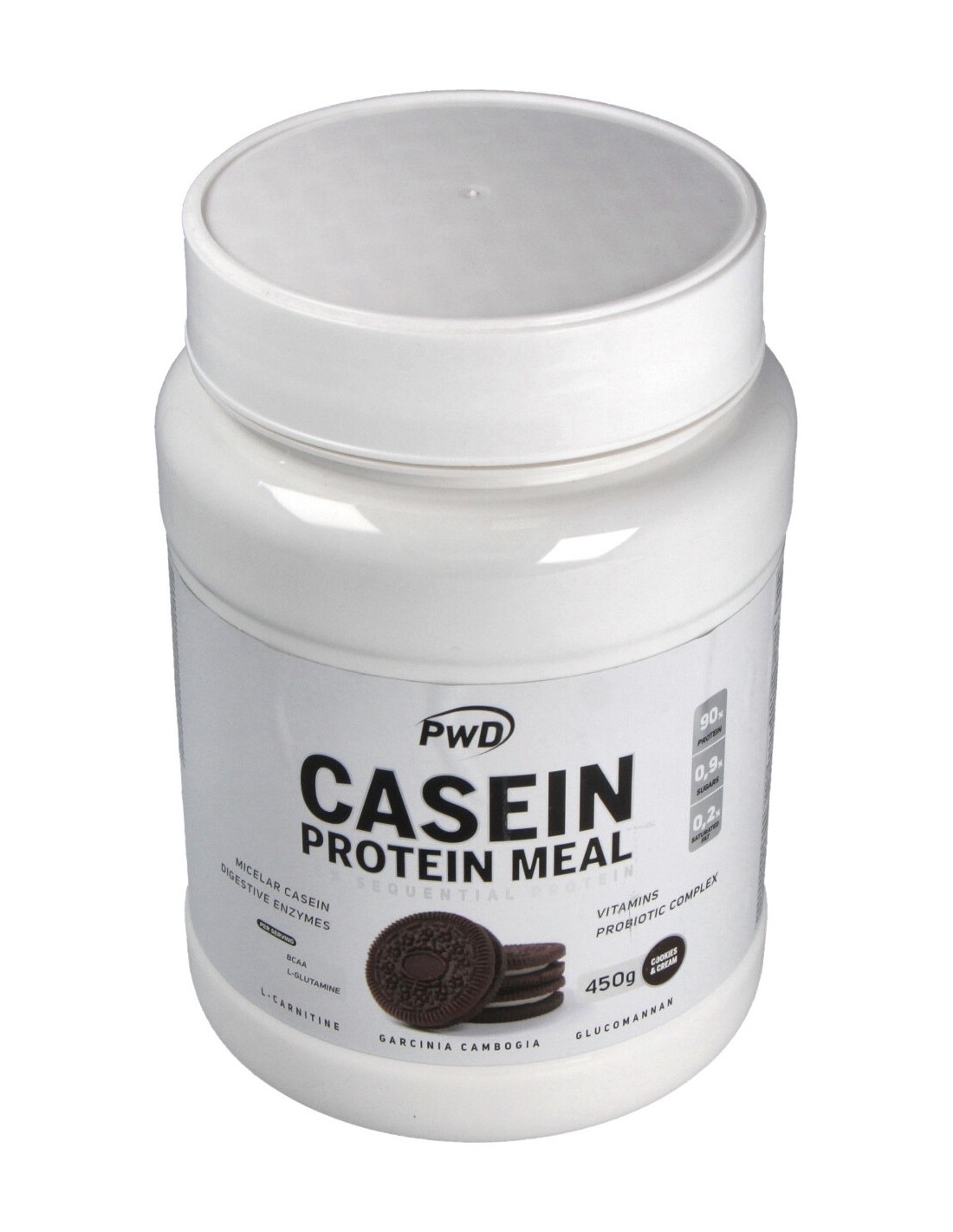 Proteína basada en la caseína micelar al 90% con índices de carbohidratos y grasa inapreciables. Está compuesta por un multivitamínico para complementar las carencias nutricionales de la dieta y L-Carnitina para un mejor transporte de la grasa a las células musculares donde ser quemada. También contiene Garcinia Cambogia y Glucomanano como saciantes aportando una sensación de plenitud y saciedad sin sensación de bloqueo intestinal. Compuesta también por enzimas digestivas y los prestigiosos probióticos UAS. Contiene elevados niveles de L Glutamina que potencian el sistema inmunológico y evitan la catabólisis muscular.CASEIN PROTEIN MEAL cookies - cream 450gr. de PWD nutrition