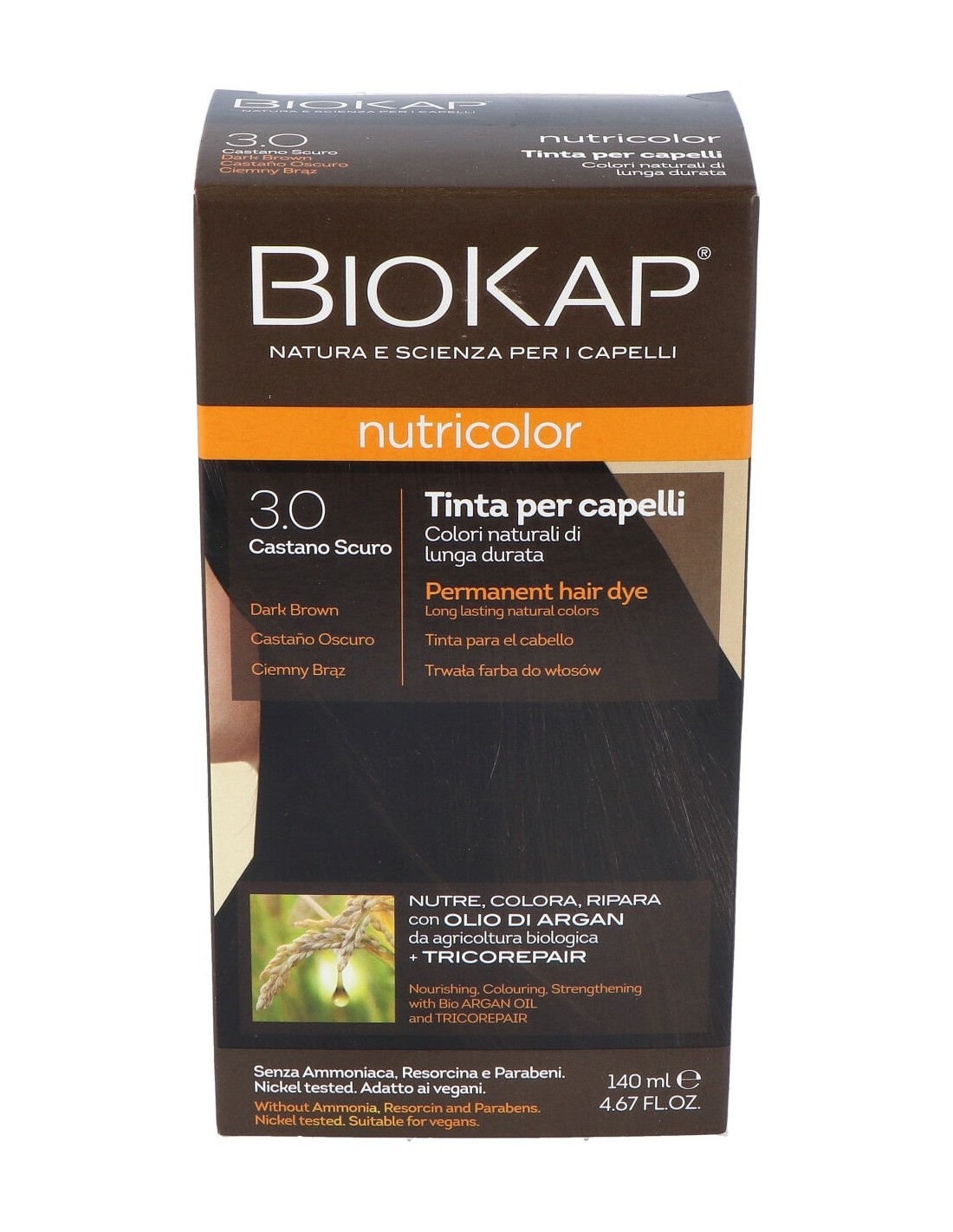 Su exclusiva fórmula con ingredientes vegetales y alta tolerancia de la piel nutre y repara el cabello mientras lo tiñe y cubre perfectamente las canas. Nutre el cabello y hace que sea más suave y brillante. Su exclusiva fórmula con ingredientes vegetales y alta tolerancia de la piel nutre y repara el cabello mientras lo tiñe y cubre perfectamente las canas. Nutre el cabello y hace que sea más suave y brillante.Precauciones:No se han descrito.Composición:TRICOREPAIR (complejo con proteínas del arroz), aceite de argán, proteína vegetal de trigo, soja, arroz y avena, Lactosafe® (ácidos frutales lipofílicos) y extracto de sauce.Crema colorante: Aqua, lauramide mea, ethanolamine, cetaryl alcohol, glyceryl stearate palmitic acid, glycerin, argana spinosa oil, hydroyzed rice protein, hydrolyz...