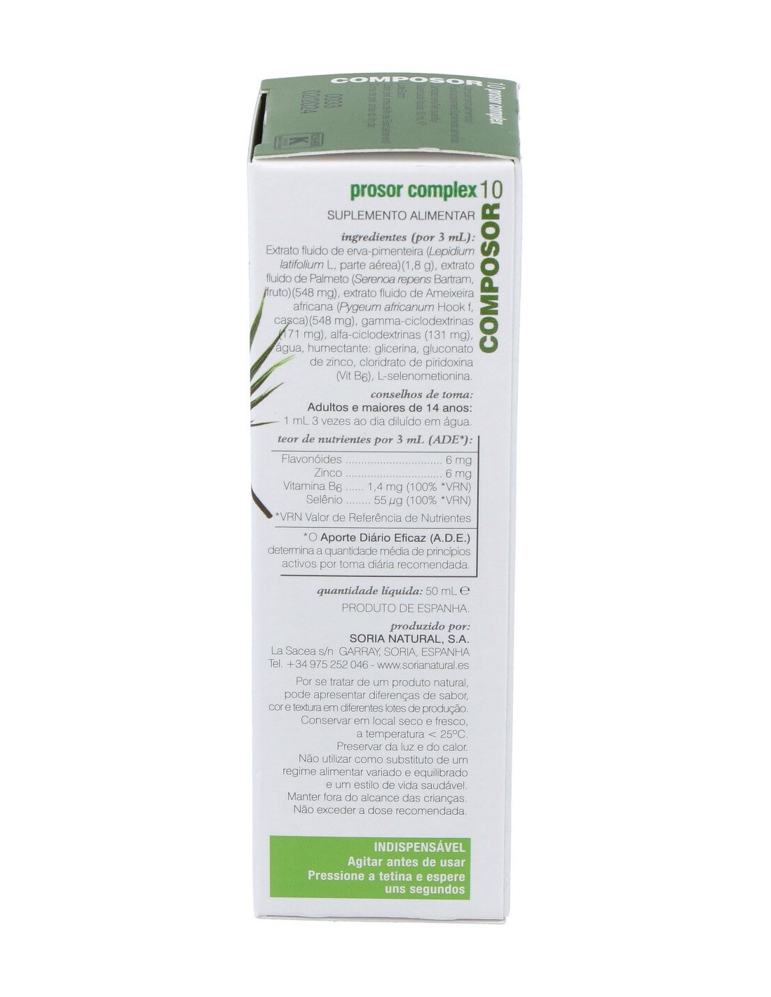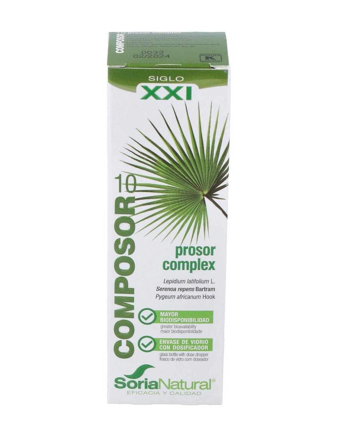 Extracto fluido de Rompepiedras (Lepidium latifolium L., hoja) (1,8 g), extracto fluido de Sabal (Serenoa repens Bartram, fruto) (548 mg), extracto fluido de Pygeum (Pygeum africanum Hook f, corteza) (548 mg), gamma-ciclodextrinas (171 mg), alfa ciclodextrinas (131 mg), agua, conservador: glicerina, gluconato de zinc, clorhidrato de piridoxina (vit B6), seleniometionina.