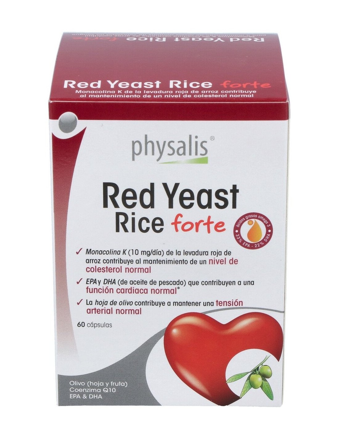 Contiene Monacolina K bajo su forma activa, un compuesto de origen natural extraído de la levadura de arroz roja que contribuye al mantenimiento de un nivel de colesterol normal. Con excelente aceite de pescado que aporta ácidos omega 3 EPA y DHA que contribuyen a una función cardíaca normal. El extracto de hoja de olivo (con 20% de oleuropeína) completa esta acción y contribuye igualmente al mantenimiento de una tensión arterial normal. Con adicción de un extracto de alta calidad de pulpa de oliva (Mediteanox® a15% de hidroxitirosol) y de coenzima Q10 naturalmente fermentada para completar la acción y aumentar la eficacia.