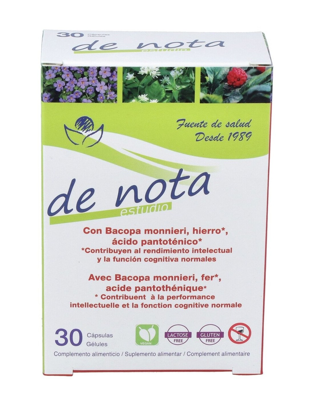 Ingredientes por 2 cápsulas: extractos nebulizados estandarizados de bacopa (Bacopa monnieri L.) 250 mg, ginseng (Panax quinquefolius L.) 100 mg, taurina 100 mg, ácido L ascórbico (Vitamina C), ginkgo (Ginkgo biloba L.) 80 mg, lactato ferroso, ácido L glutámico 26 mg, L arginina 26 mg, sulfato de zinc, acetato de DL-alfa tocoferilo (vitamina E), clorhidrato de piridoxina (Vitamina B6), pantotenato cálcico (Vitamina B5), betacaroteno (Vitamina A), yoduro potásico, colecalciferol (Vitamina D), cianocobalamina (vitamina B12), antiaglomerante (estearato de magnesio), agente de carga (celulosa microcristalina), cápsula (gelatina vegetal).