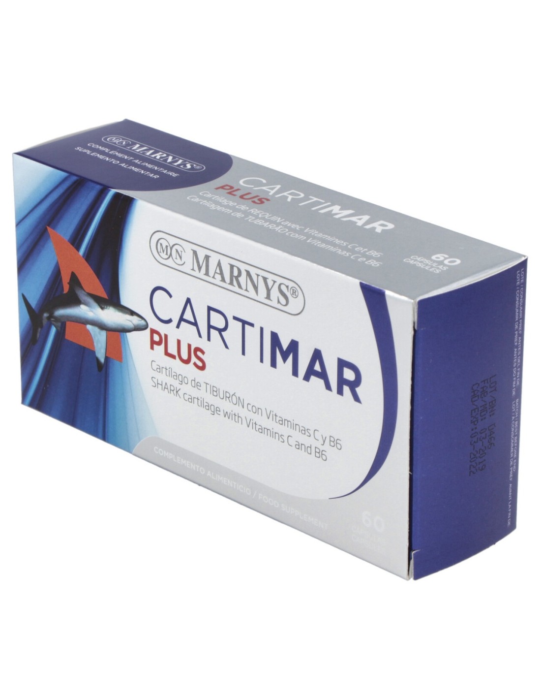Contribuye a la formación normal de colágeno para el funcionamiento normal de los cartílagos y contribuye a disminuir fatiga y cansancio. Contribuye a la formación normal de colágeno para el funcionamiento normal de los cartílagos y contribuye a disminuir fatiga y cansancio.Precauciones:No se han descrito.Composición:Cartílago de Tiburón, Vitamina C, Vitamina B6. Cápsula: gelatina.Por 3 cápsulas:Cartílago de tiburón.....1.476,51 mgVitamina C..................22,5 mgVitamina B6................0,99 mg*Contiene ingredientes a base de pescado.Modo de empleo:Tomar 3-6 cápsulas al día, 1-2 cápsulas antes de cada comida....