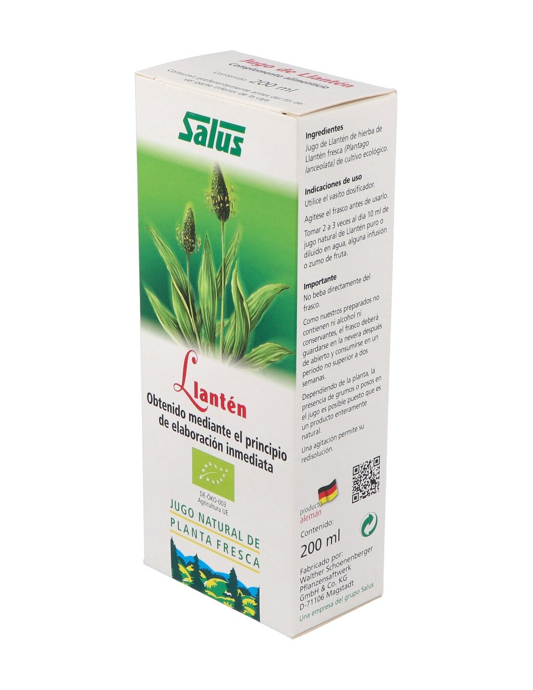 El jugo de llantén se obtiene por prensado de la planta fresca en su óptimo punto de maduración, por lo que ofrece el espectro completo de principios tal y como se encuentran en la planta fresca, sin alteración alguna. Ayuda a suavizar la garganta.