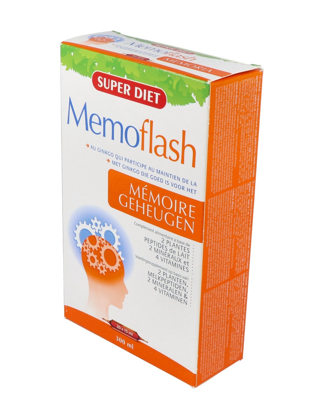 Extracto de Centella asiática (300 mg) – zumo concentrado de piña y de pomelo -Péptidos de leche (180 mg) - Extracto de Ginkgo biloba (225 mg) (soporte maltodextrina) – Aroma natural de cítricos y otros aromas naturales – Minerales : Levadura enriquecida con Selenio (22 µg) y Gluconato de Zinc (10 mg) – Vitaminas B5 (1,2 mg), B6 (1,4 mg), B2 (1,4 mg) y B1 (0,55 mg)