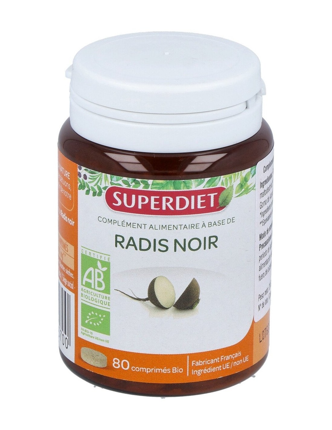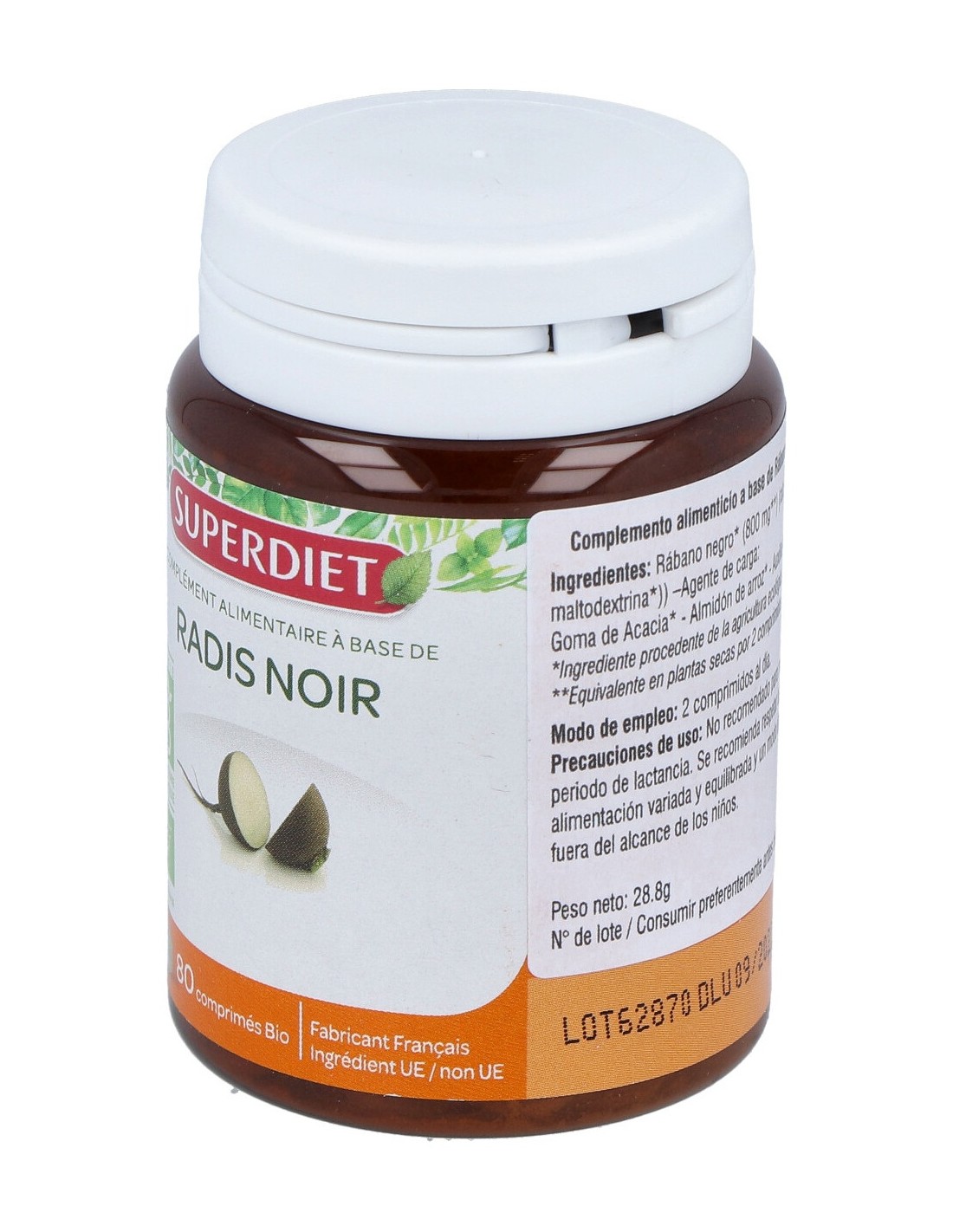 Rábano negro* (Raíz - Raphanus sativus niger ) (800 mg) (Polvo y extracto (soporte: maltodextrina*)) – Agente de carga: goma de Acacia* - Almidon de arroz* Antiaglomerante: Talco.
