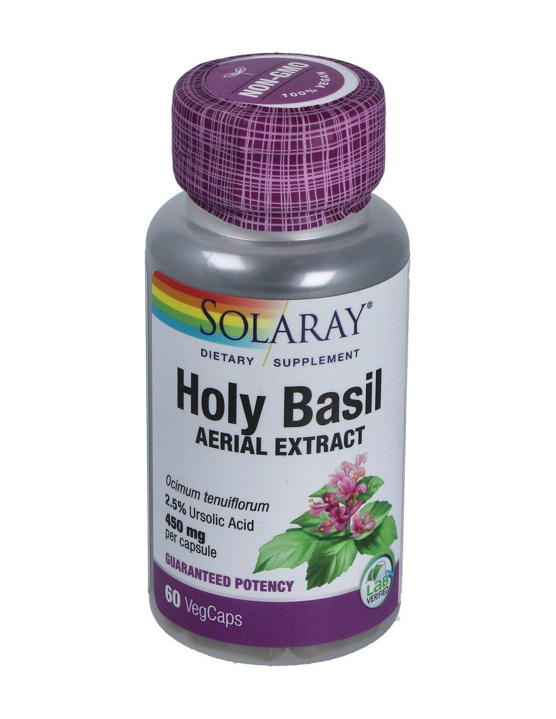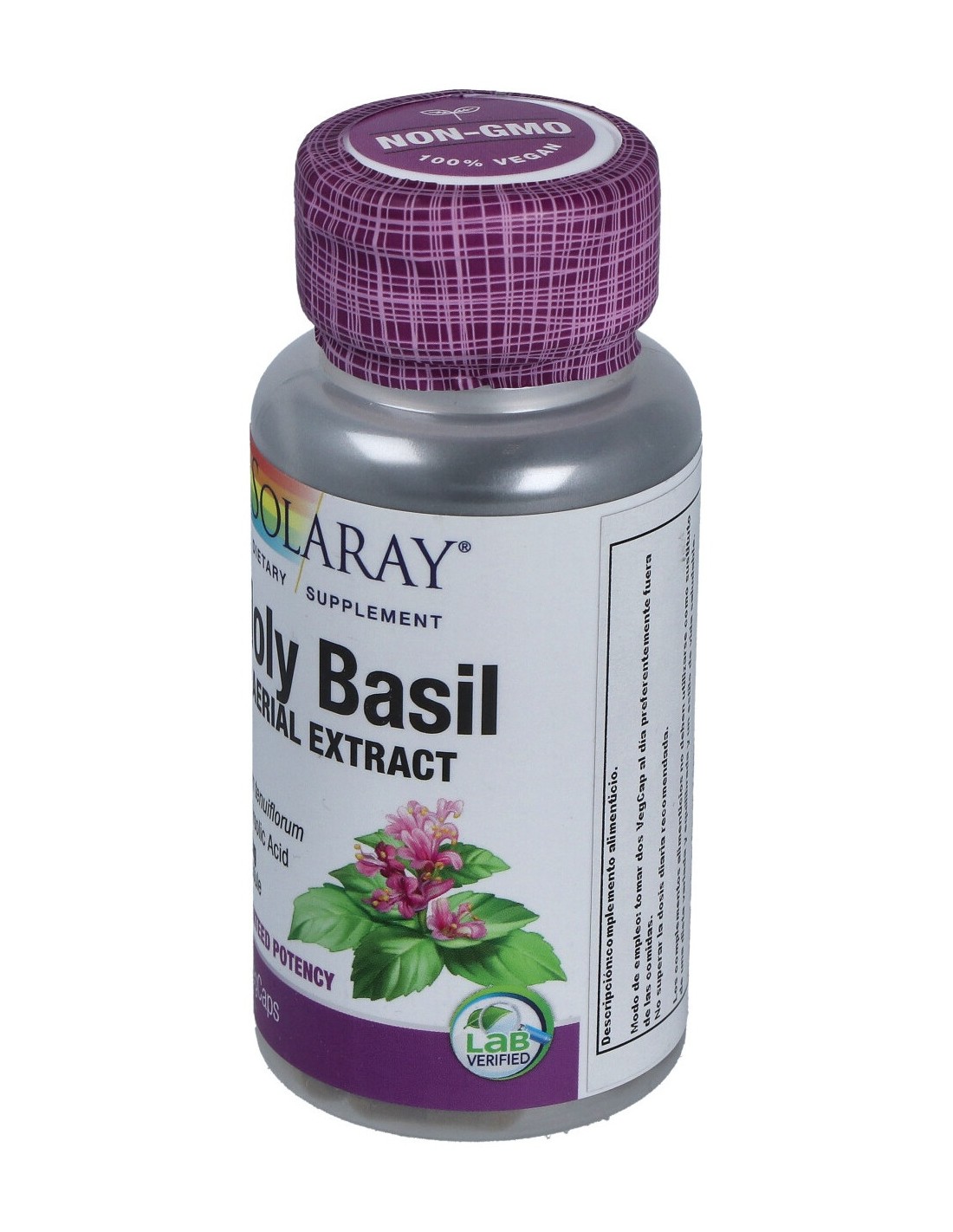 Holy basil (Ocimum tenuiflorum) (extracto de parte aérea) (garantiza 2.5% ácido ursólico), cápsula de celulosa vegetal, agente de carga: celulosa, antiaglomerante: sílice y esterato de magnesio.