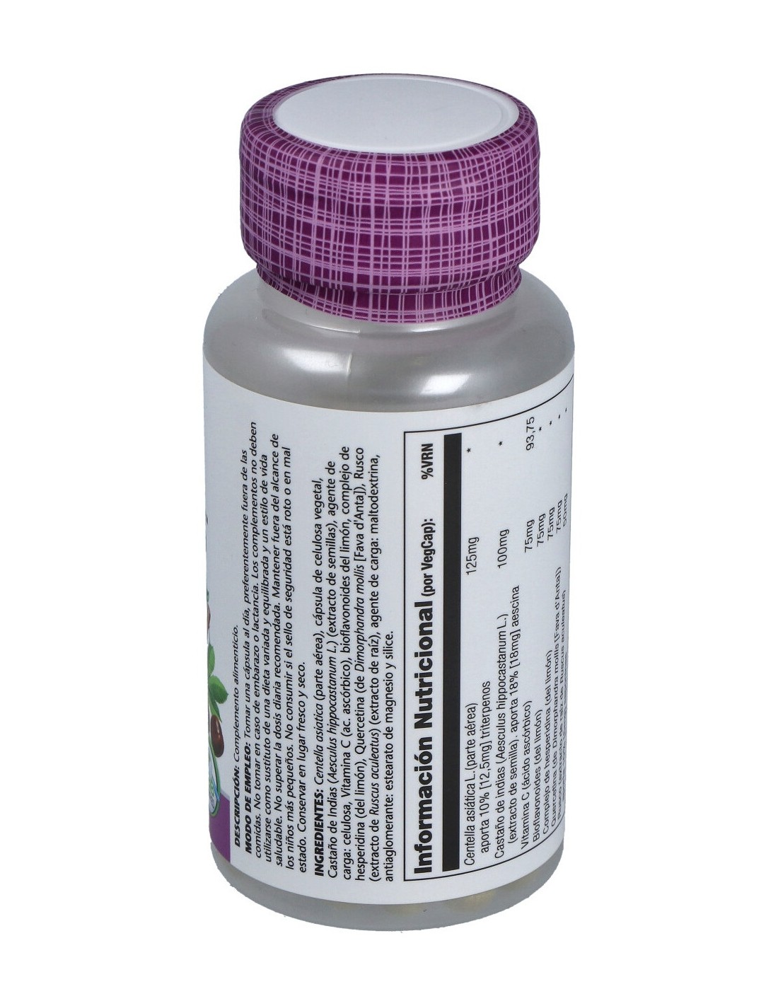 Centella asiática (parte aérea)(garantiza 10% triterpenos), cápsula de celulosa vegetal, Castaño de Indias(Aesculus hippocastanun L.)(extracto de semillas (garantiza 18A% aescina), agente de carga: celulosa,Vitamina C(ácido ascórbico), bioflavonoides del limón,complejo de hesperidina (del limón) , quercitina (de Dimorphandra mollis[Fava d´Anta]), Rusco (extracto de Ruscus aculeatus) (extracto de raíz) (garantiza10% saponinas), agente de carga: maltodextrina, antiaglomerante: estearato de magnesio y sílice.