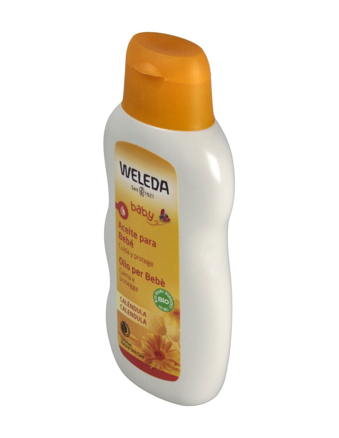 Weleda aceite calendula bebé contiene los siguientes ingredientes: Aceite de sésamo, Aceite de almendra dulce, Extracto de flores de caléndula, Extracto de flores de manzanilla, Aceites esenciales naturales, Limoneno, Linalool, Citral. Estos ingredientes tienen las siguientes propiedades: