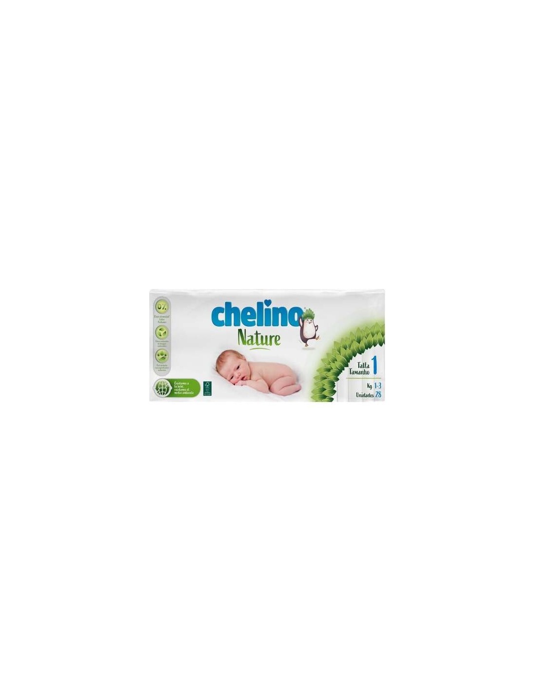 DESCRIPCIÓNLos pañales Chelino Nature ® han sido especialmente diseñadospara asegurar el bienestar de toda la familia a través del cuidadoexperto del bebé y del medio ambiente.CARACTERÍSTICASCuidamos a tu bebéLos pañales incorporan perlas superabsobentes y una lámina blanca que difunde la orina para que el bebé esté protegido de la humedad.Están anatómicamente diseñados y cuentan con hilos elásticos en los laterales para un ajuste óptimo.Poseen un acabado especial en la zona umbilical, que ayuda a una rápida cicatrización.Incorporan etiquetas adhesivas de velcro reposicionable que permiten abrir y cerrar cuantas veces sea necesario sin perder sujeción.Presentan una exclusiva e intuitiva guía de colocación con indicador de tallas en la parte frontal del pañal, que ayuda a seleccionar la talla más adecuada para el bebé para su mayor comodidad.Dermatológicamente testadosNo contienen látexSin perfumes añadidosCuidamos del medio ambienteLa celulosa que compone los pañales proviene de bosques gestionados de forma responsable.Para su fabricación se emplea energía procedente de fuentes sostenibles para proteger nuestro entorno.Las bolsas están hechas con materiales reprocesadosLas cajas son reciclables y se componen 100% de papeles de fibra reciclada Tallas: 2: 3-6 Kg; 3: 4-10 Kg; 4; 9-15 Kg; 5: 13-18Kg; 6: 17-28 Kg