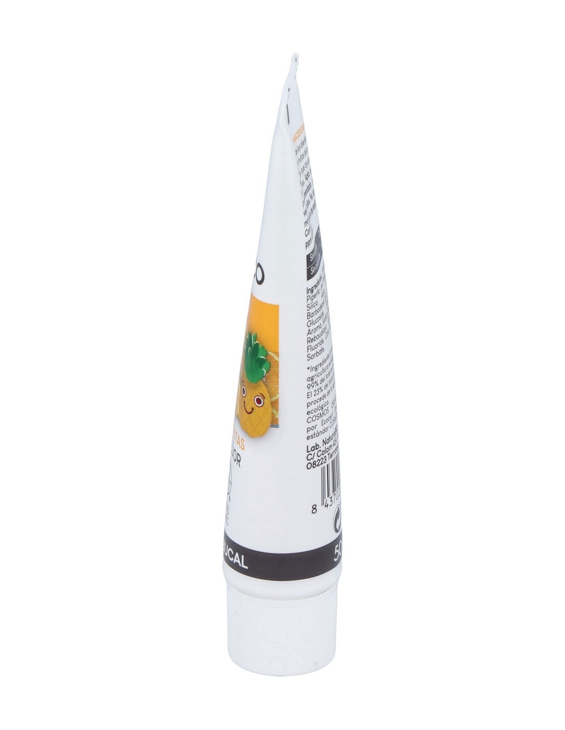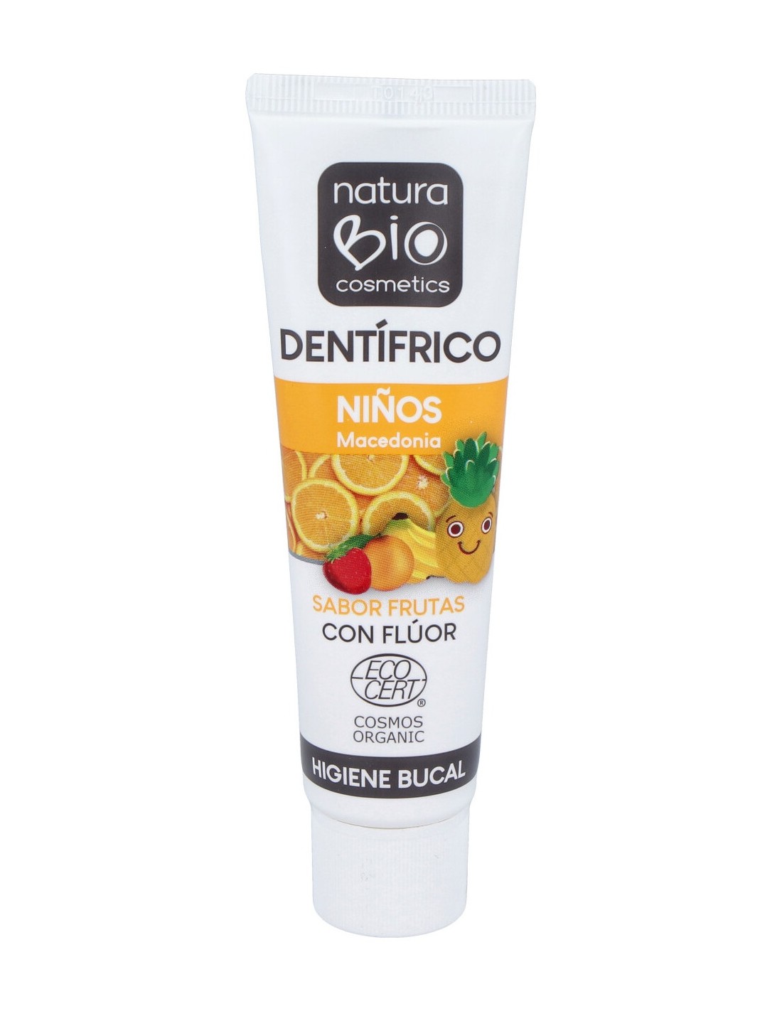 Con agradable sabor a macedonia y con flúor adecuado para niños a partir de 3 años. Apto para veganos. Sin colorantes. Con certificado EcoCert.