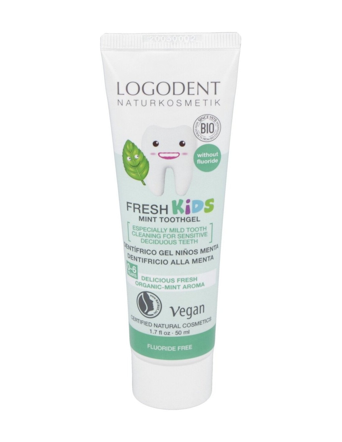 Para unos dientes sanos desde su primer diente. Aroma natural de menta. Para niños de 0 a 6 años. Apto para veganos.