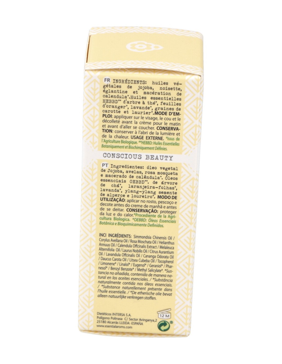 Aceites vegetales vírgenes de 1ª presión en frío de: jojoba, avellana, rosa mosqueta y macerado de caléndula. Aceites esenciales A.E.B.B.D.*: árbol del té, naranjo-hojas, lavanda, semilla de zanahoria y laurel.