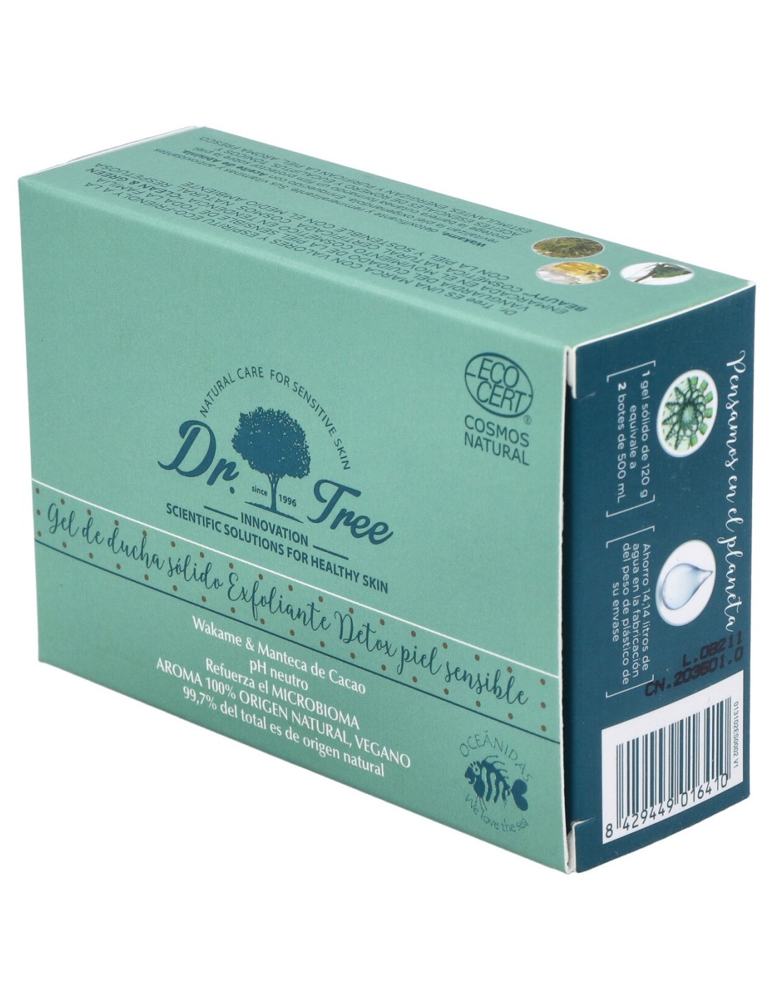 Gel de ducha sólido creado especialmente para limpiar, cuidar, nutrir, proteger y fortalecer la piel. Es un producto exclusivo de la marca Dr. Tree. Contiene un 100% de ingredientes naturales, lo que le permite brindar una fragancia delicada, reconfortante y vegana. Libre de silicona, sulfatos y jabón. Su fórmula natural ayuda a perfumar la piel con un leve olor a romero y eucalipto. Sus funciones principales son exfoliar, detoxificar, remineralizar y oxigenar. Pensado para los individuos que tienen problemas de resequedad en la piel, ya que otorga los nutrientes necesarios para mantenerla sana y saludable. Se recomienda su aplicación durante el baño diario, pero no en las zonas sensibles del cuerpo. No emplear conjuntamente con jabones abrasivos que puedan maltratar la piel. Enjuagar rápidamente con abundante agua si el producto cae en los ojos.