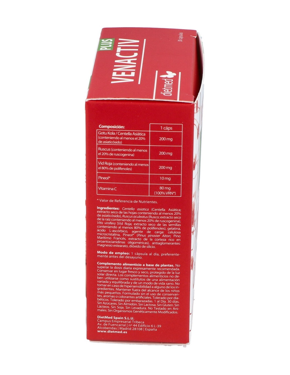 Centella asiática (Centella Asiática: extracto seco de las hojas conteniendo al menos 20% de asiaticósido), Ruscus aculeatus (Rusco: extracto seco de la raíz conteniendo al menos 20% de ruscogenina), Vitis vinifera (Vid Roja: extracto seco de las semillas conteniendo al menos 80% de polifenoles), gelatina, ácido L-ascórbico, agente de carga: celulosa microcristalina, Pineol®( Pinus pinaster Aiton: Pino Marítimo Francés, extracto de la corteza rico en proantocianidinas oligoméricas), antiaglomerantes: magnesio estearato, dióxido de silicio.
