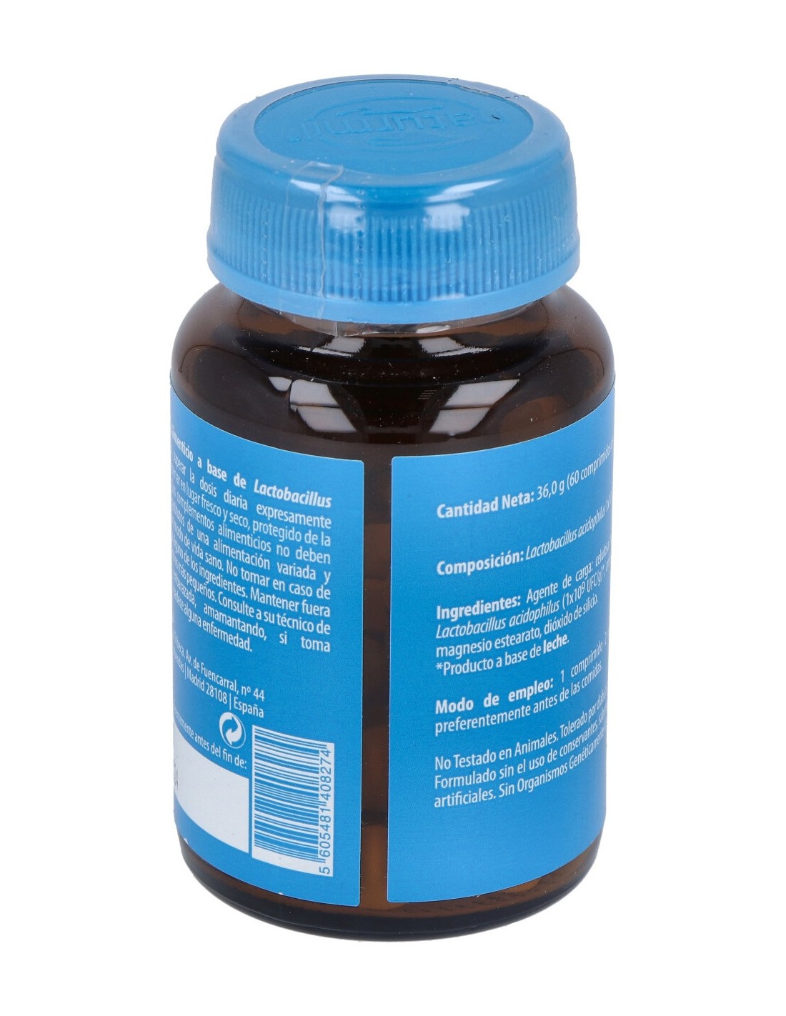 Agente de carga: celulosa microcristalina, Lactobacillus acidophilus (1x109 UFC/g), antiaglomerantes: estearato de magnesio, dióxido de silicio.