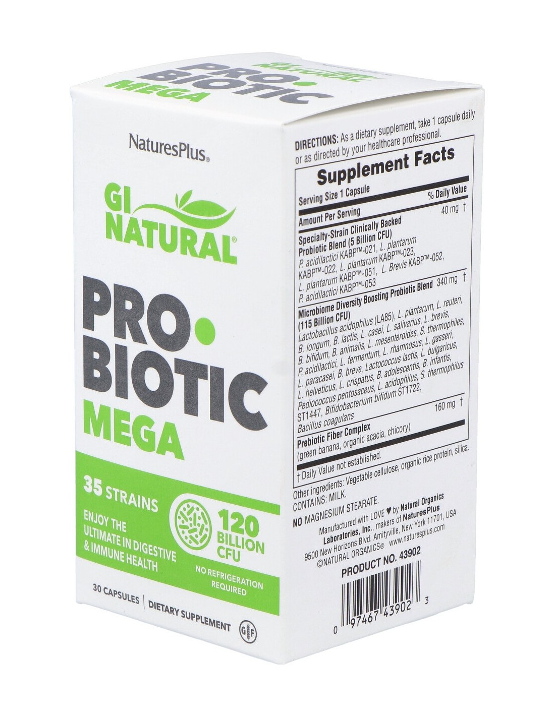 Mezcla de bacterias beneficiosas que contribuyen a la diversidad del microbioma (Lactobacillus acidophilus, Lactobacillus plantarum, Lactobacillus reuteri, Bifidobacterium longum, Bifidobacterium lactis, Lactobacillus casei, Lactobacillus salivarius, Lactobacillus brevis, Bifidobacterium bifidum, Bifidobacterium animalis , Leuconostoc mesentoroides, Streptococcus thermophilus, Pediococcus acidilactici, Lactobacillus fermentum, Lactobacillus rhamnosus, Lactobacillus gasseri, Lactobacillus paracasei, Bifidobacterium breve, Lactococcus lactis, Lactobacillus bulgaricus, Lactobacillus helveticus, Lactobacillus crispatus, Bifidobacterium adolescentis , Bifidobacterium infantis, Pediococcus pentosaceus, Lactobacillus acidophilus DDS-1, Streptococcus thermophilus ST1447, Bifidobacterium bifidum ST1722, Bacillus coagulans), Complejo de fibras (plátano verde (Musa paradisiaca), goma de acacia (Acacia senegal), raíz de achicoria (Cichorium intybus)), Agente de recubrimiento (celulosa vegetal), proteína de arroz (Oryza sativa), Cepas específicas de Bacterias Beneficiosas (Pediococcus acidilactici KABP™-021, Lactobacillus plantarum KABP™-022, Lactobacillus plantarum KABP™-023, Lactobacillus plantarum KABP™ -051, Lactobacillus brevis KABP™-052, Pediococcus acidilactici KABP™ -053, Antiaglomerante (dióxido de silicio).