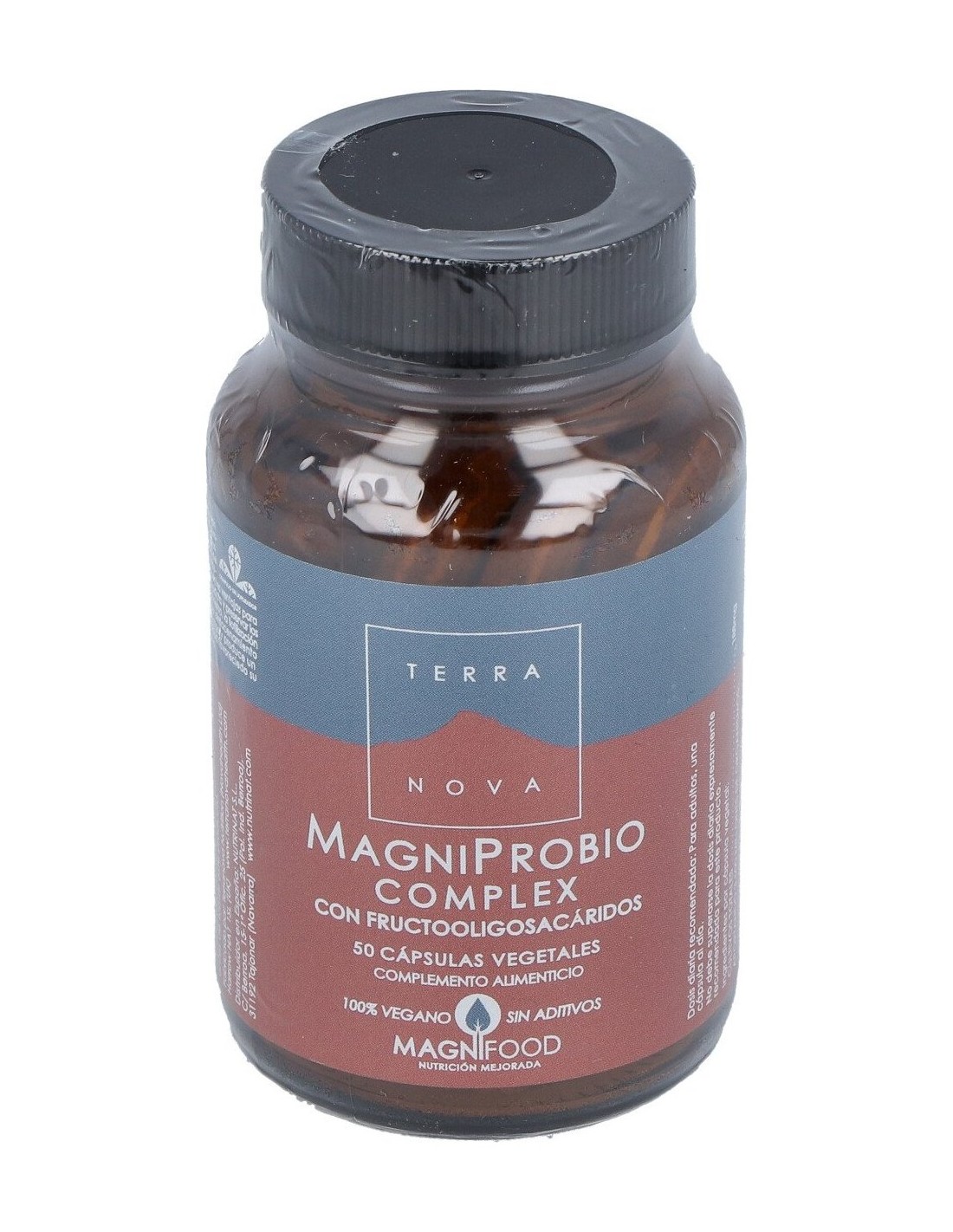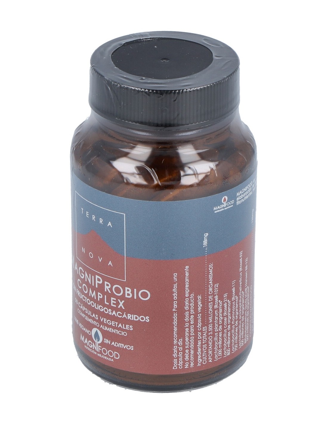 Complemento alimenticio a base de cultivos de lactobacilos y bifidobacterias, plantas del Complejo Magnifood y fructo-oligosacáridos. Apto para vegetarianos y veganos.