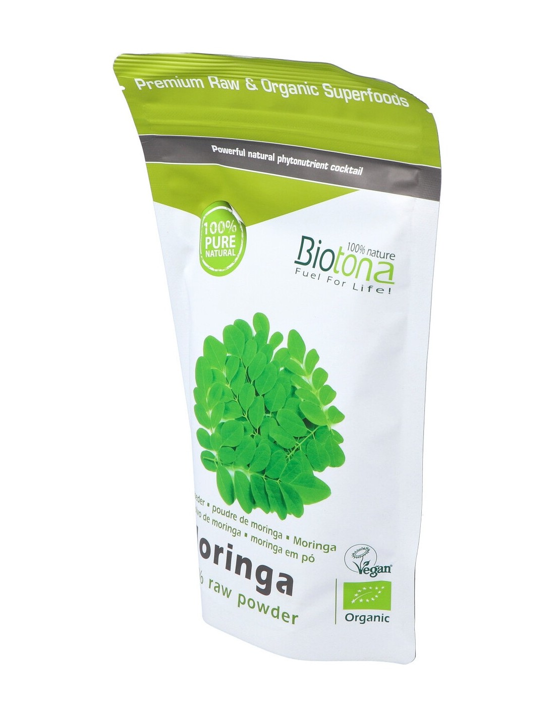 Biotona Moringa se compone al 100% de hojas de Moringa procedentes de África, las cuales, después de una recolección y lavado minucioso son deshidratadas al aire libre y a la sombra para conservar todo su valor nutricional.