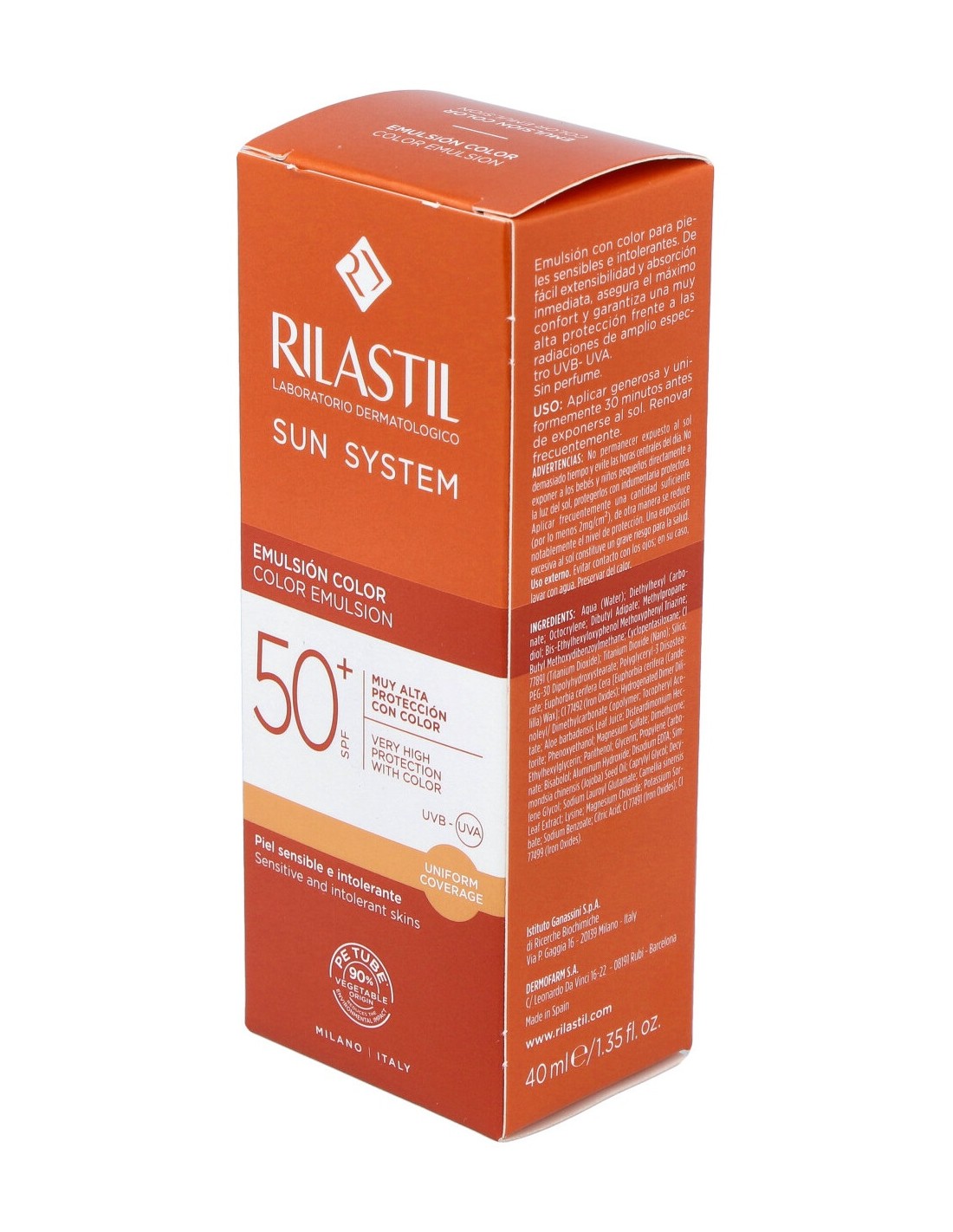 Foto-maquillaje en emulsión con color para rostro, cuello y escote. Con filtros biodegradables y fórmula para piel sensible.