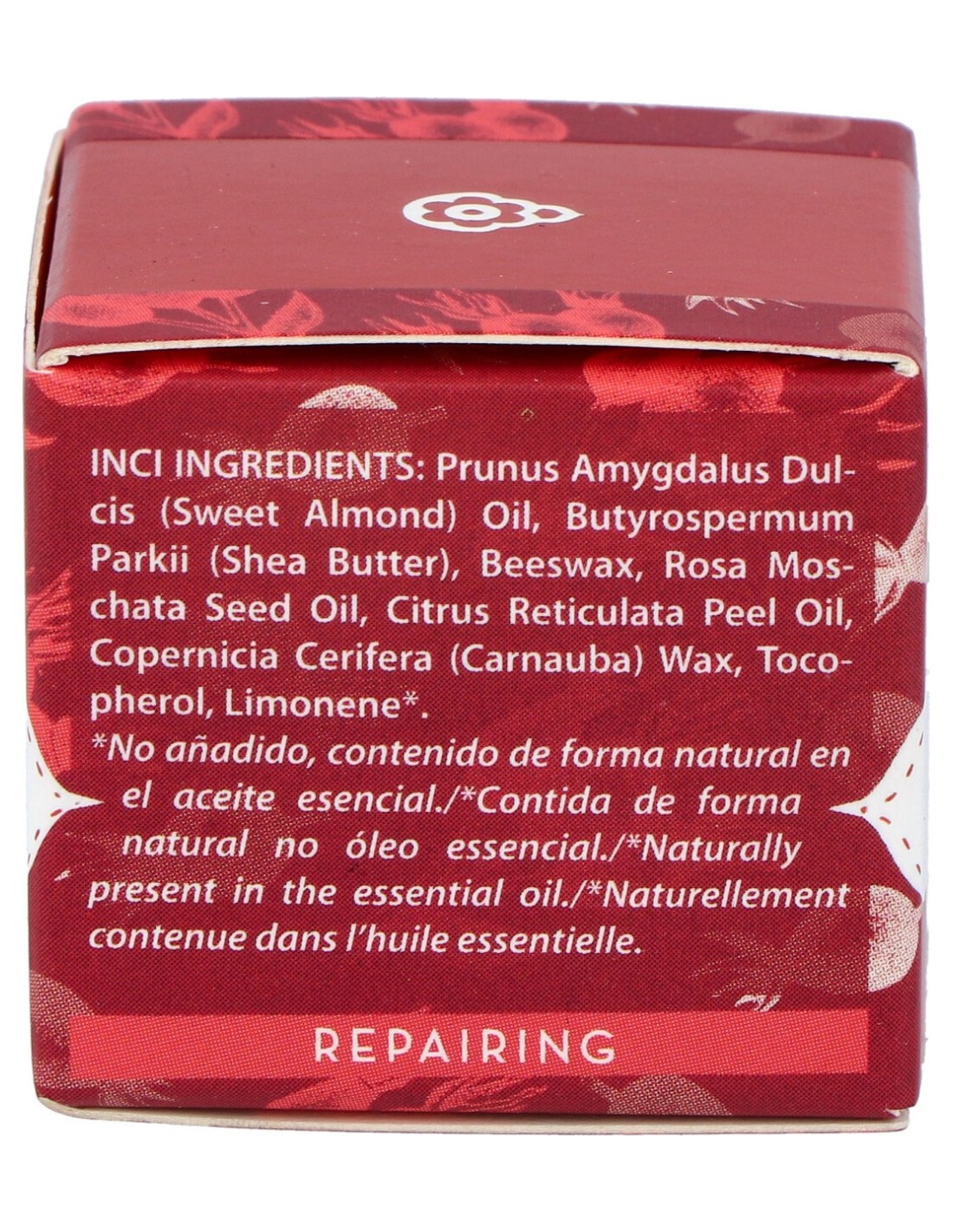 Manteca de Karité, Aceite de Almendra Dulce (Prunus dulcis), Copernicia Cerifera (Carnauba) Wax / Cera Carnauba, Aceite de rosa mosqueta, Cera de abejas, Rosa mosqueta, Esencia de cáscara de mandarina.