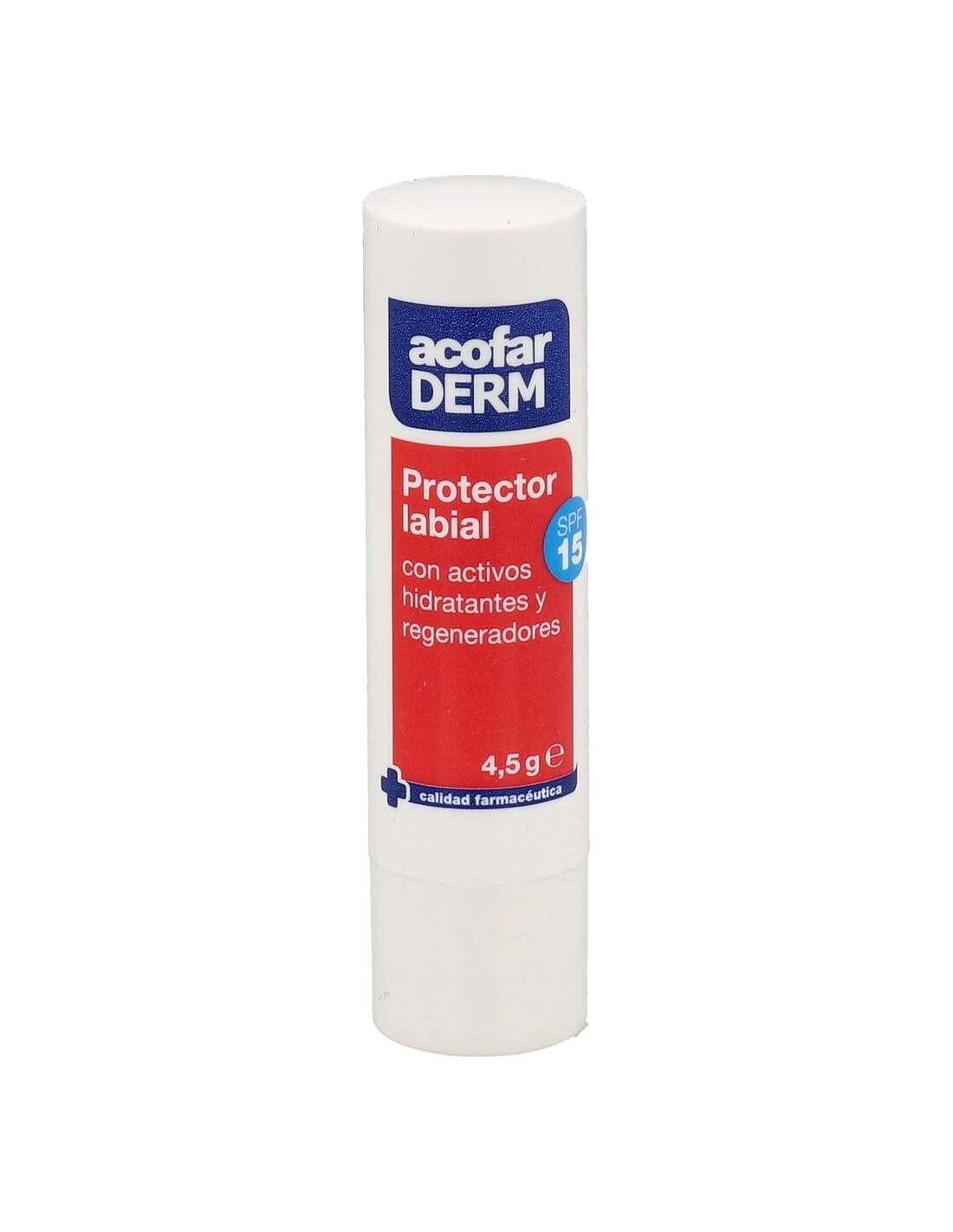 Es un hidratante para los labios con filtros de protección solar SPF15+. Protege de la exposición frecuente al sol y mantiene la humedad. Revitaliza y regenera la piel mientras minimiza la resequedad. Sus ingredientes activos actúan para devolver la elasticidad y suavidad natural. Además, evita las arrugas, las grietas y las manchas. Es un producto de la marca Acofarderm, el cual ha sido probado dermatológicamente. No causa irritaciones ni alergias.
