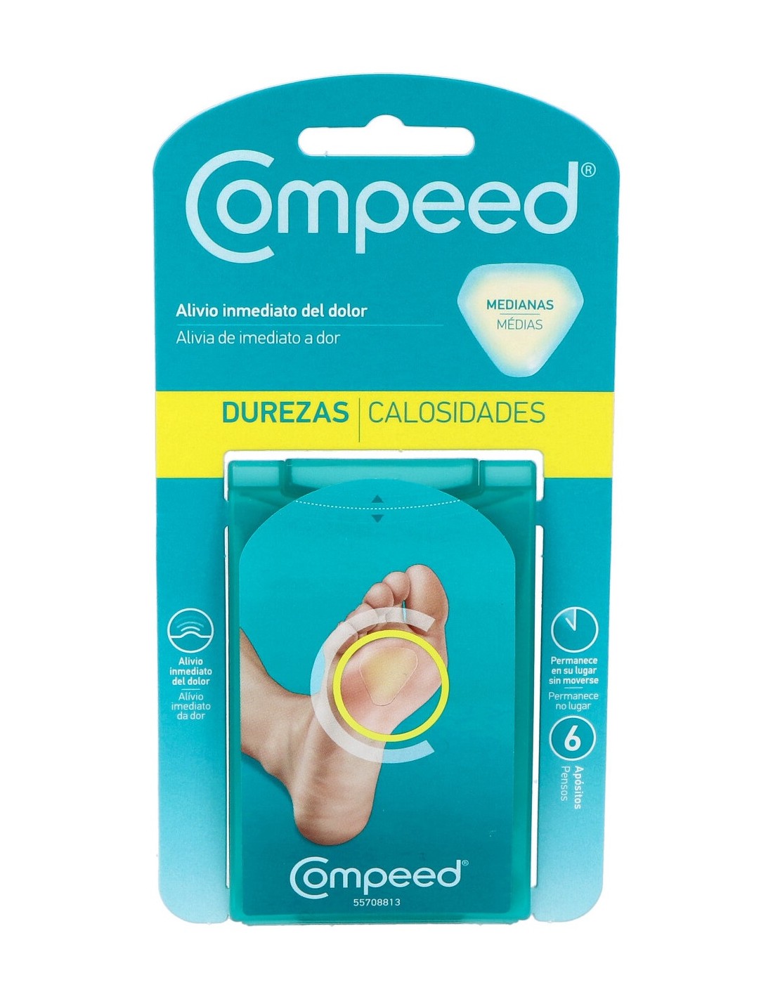 Compeed® durezas talla mediana generan una cómoda almohadilla que funciona como segunda piel gracias a la tecnología hidrocoloide, protege a los pies de la fricción y rozaduras garantizando disminución total del dolor mientras hidrata y suaviza las asperezas.