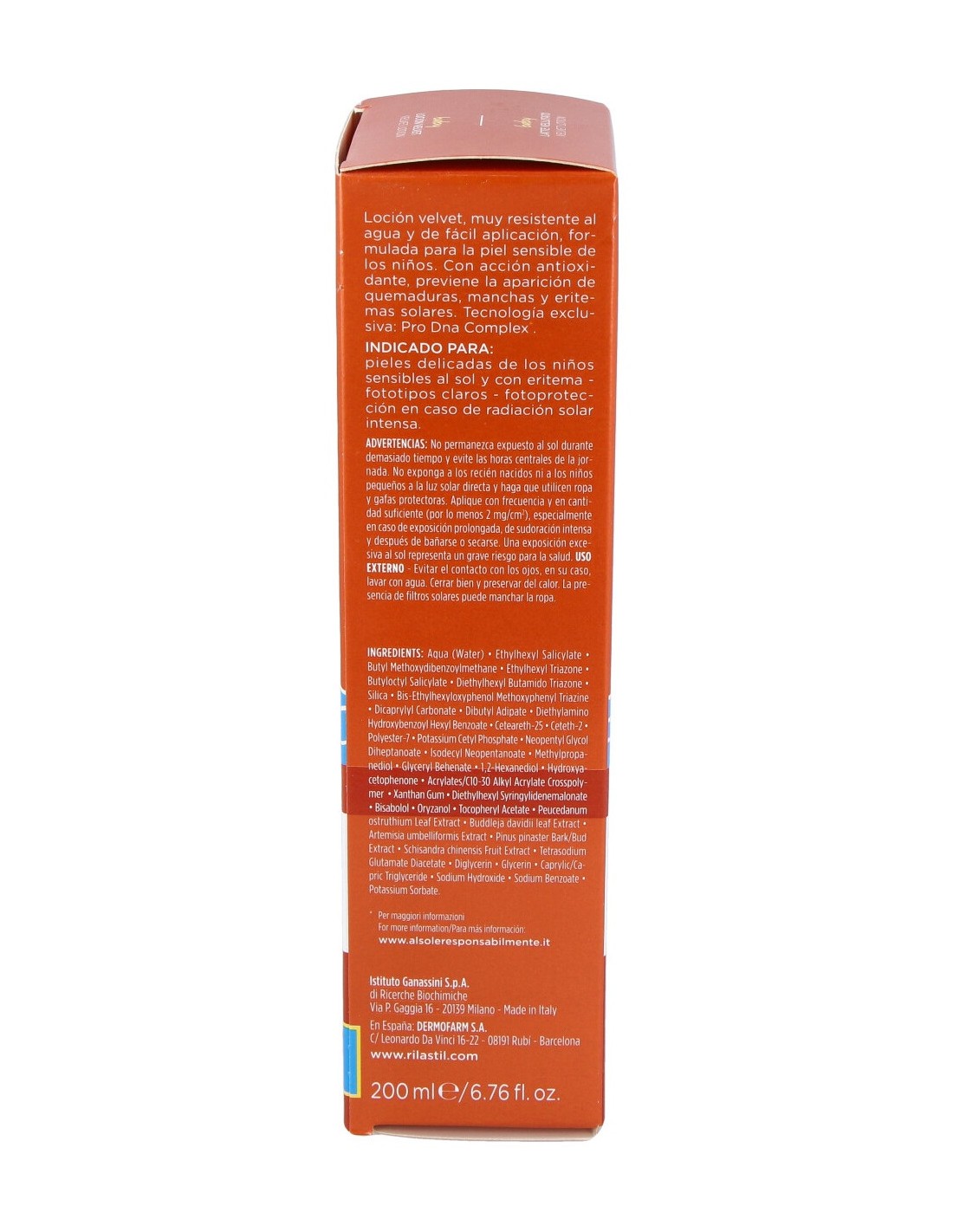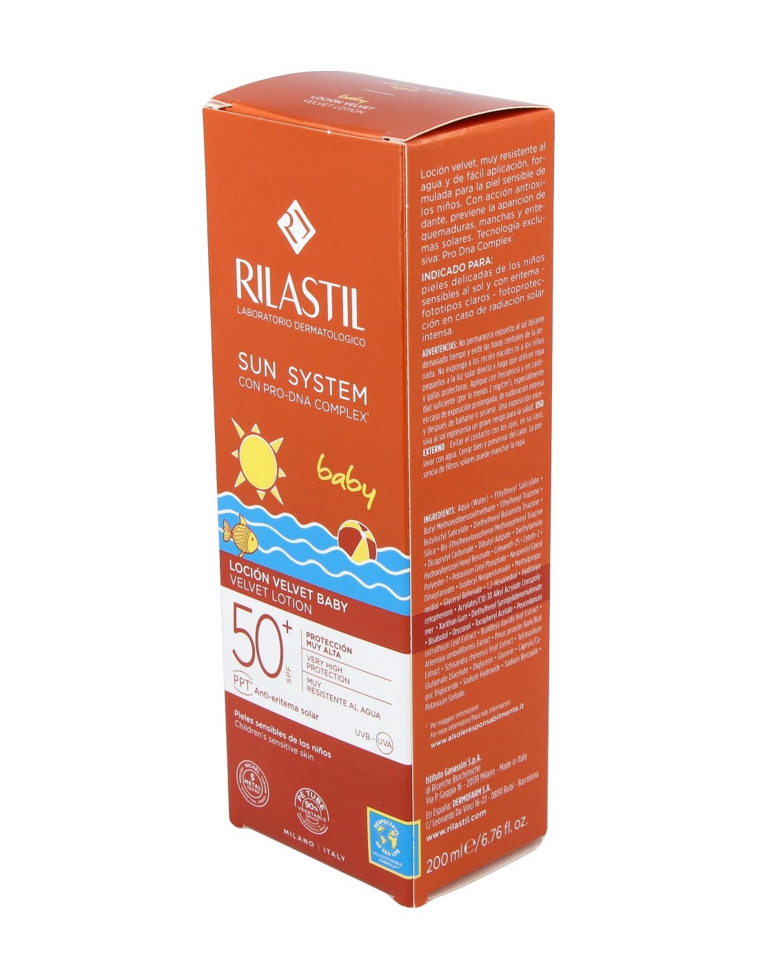Rilastil Sun System 50+ Baby Leche Velluto 200ml es un protector solar para bebés en textura emulsión fluida especialmente formulada para la piel de los niños, resistente al agua, de fácil aplicación y rápida absorción. Garantiza protección frente a las radiaciones UVB-UVA de amplio espectro y el máximo confort en la piel, previene la aparición de quemaduras solares, manchas y quemaduras solares. Está indicado para la piel delicada y sensible de los niños.