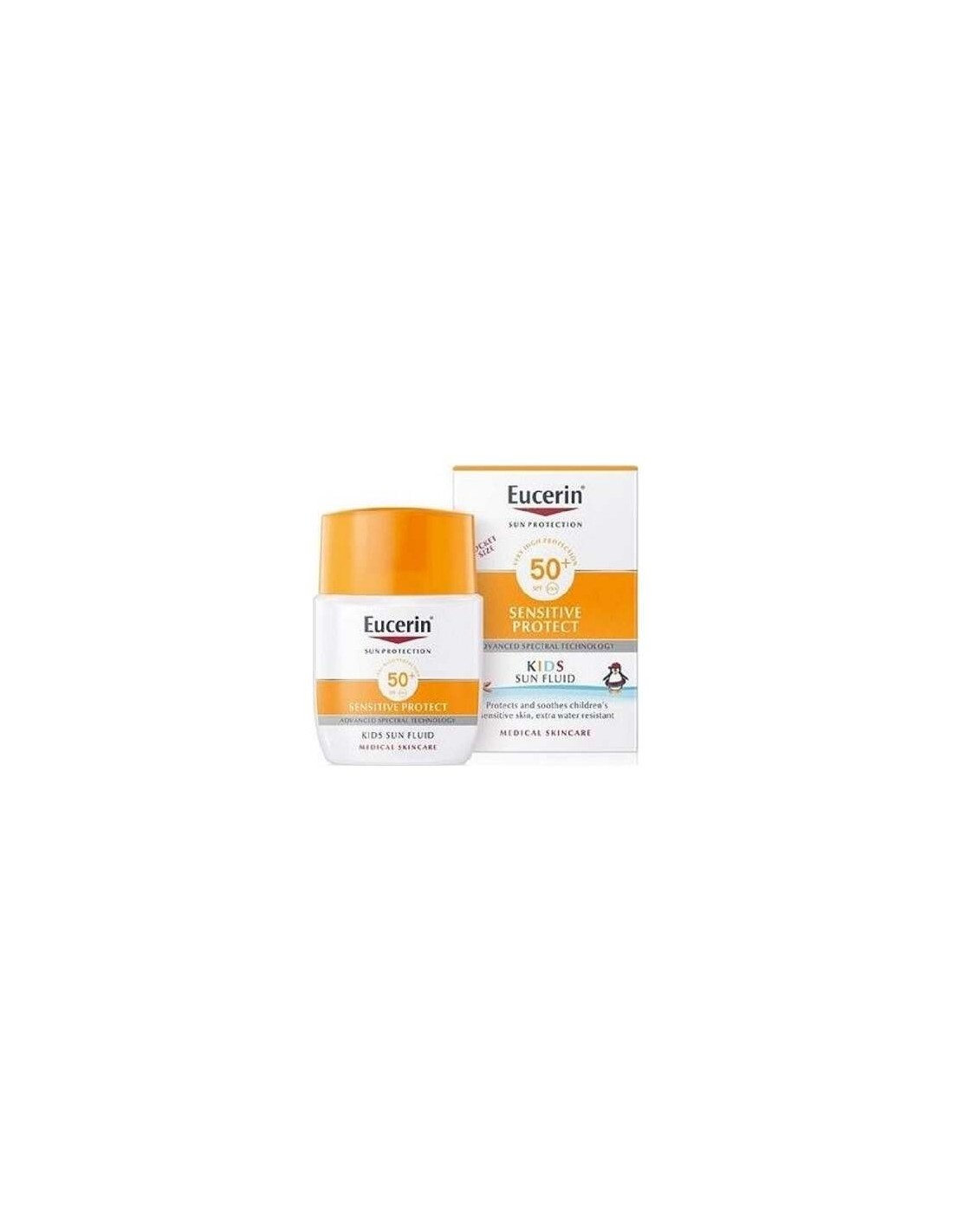 Eucerin Sun Fluido Infantil Sensitive Portect SPF50+ 50ml es un protector solar muy alta para niños que ayuda a proteger la piel sensible de los rayos UVA y UVB del sol.