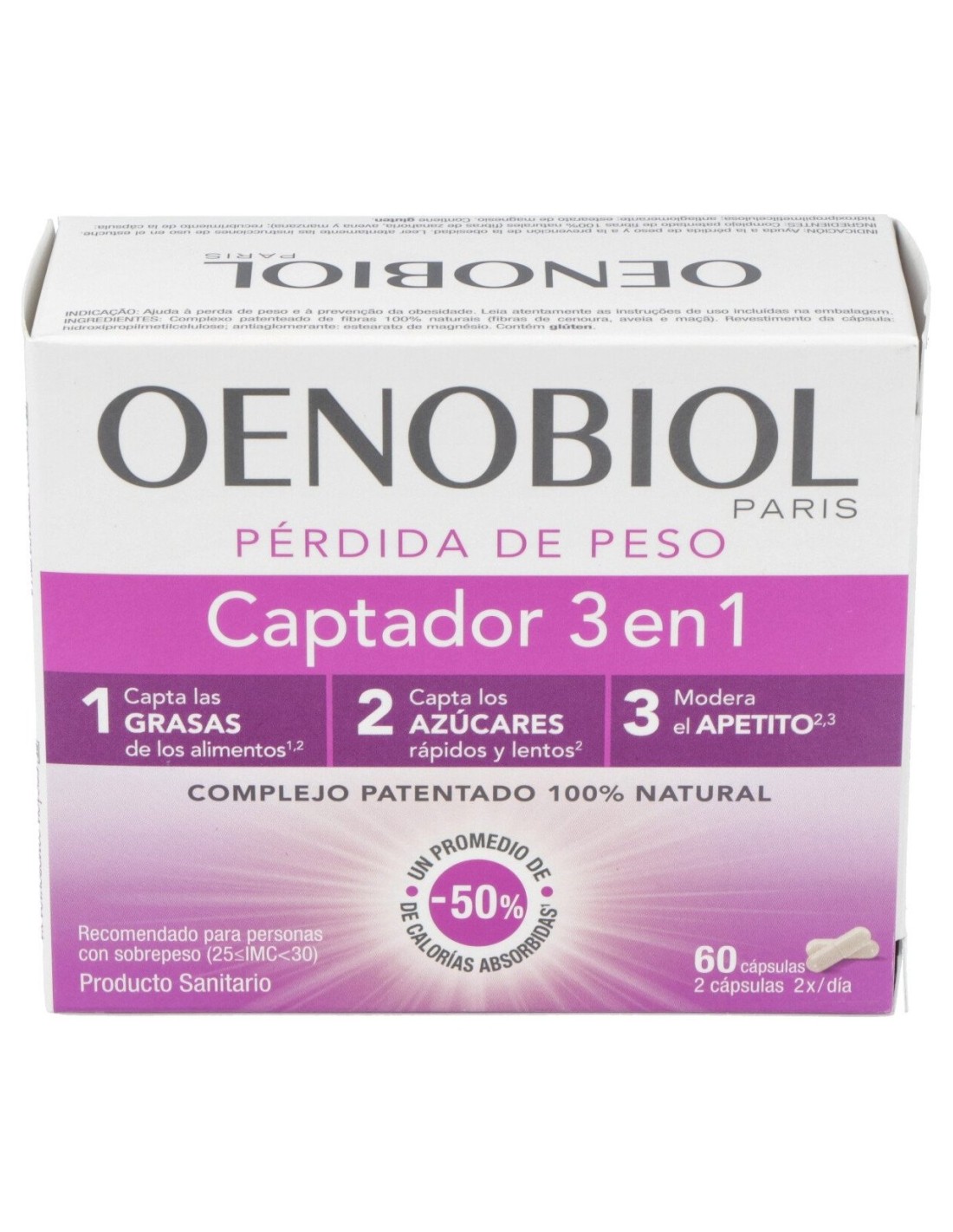 Oenobiol Captador Grasas 3 en 1 60caps es un complemento alimenticio que actúa captando las grasas y los azúcares rápidos y contribuye a ralentizar la asimilación de los azúcares lentos.