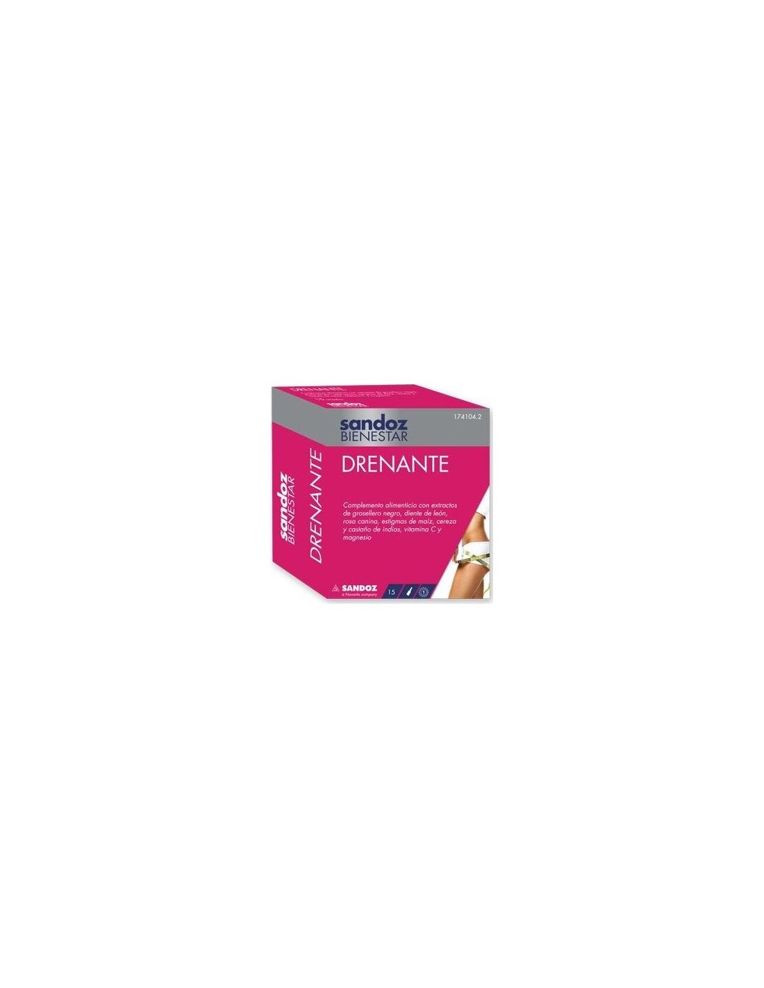 Sandoz Bienestar Drenante es un complemento alimenticio que contiene extractos de grosellero negro, diente de león, rosa canina, estigmas de maíz, cereza, castaño de indas, vitamina C y magnesio.La mezcla de todos éstos componentes actúan de manera muy eficaz para mantener tu cuerpo más ligero.