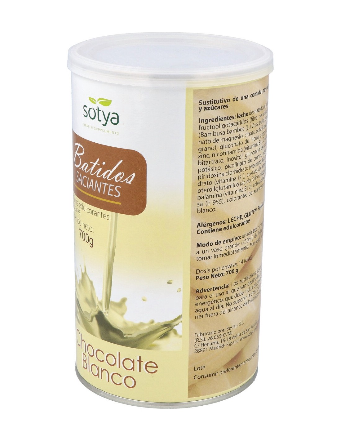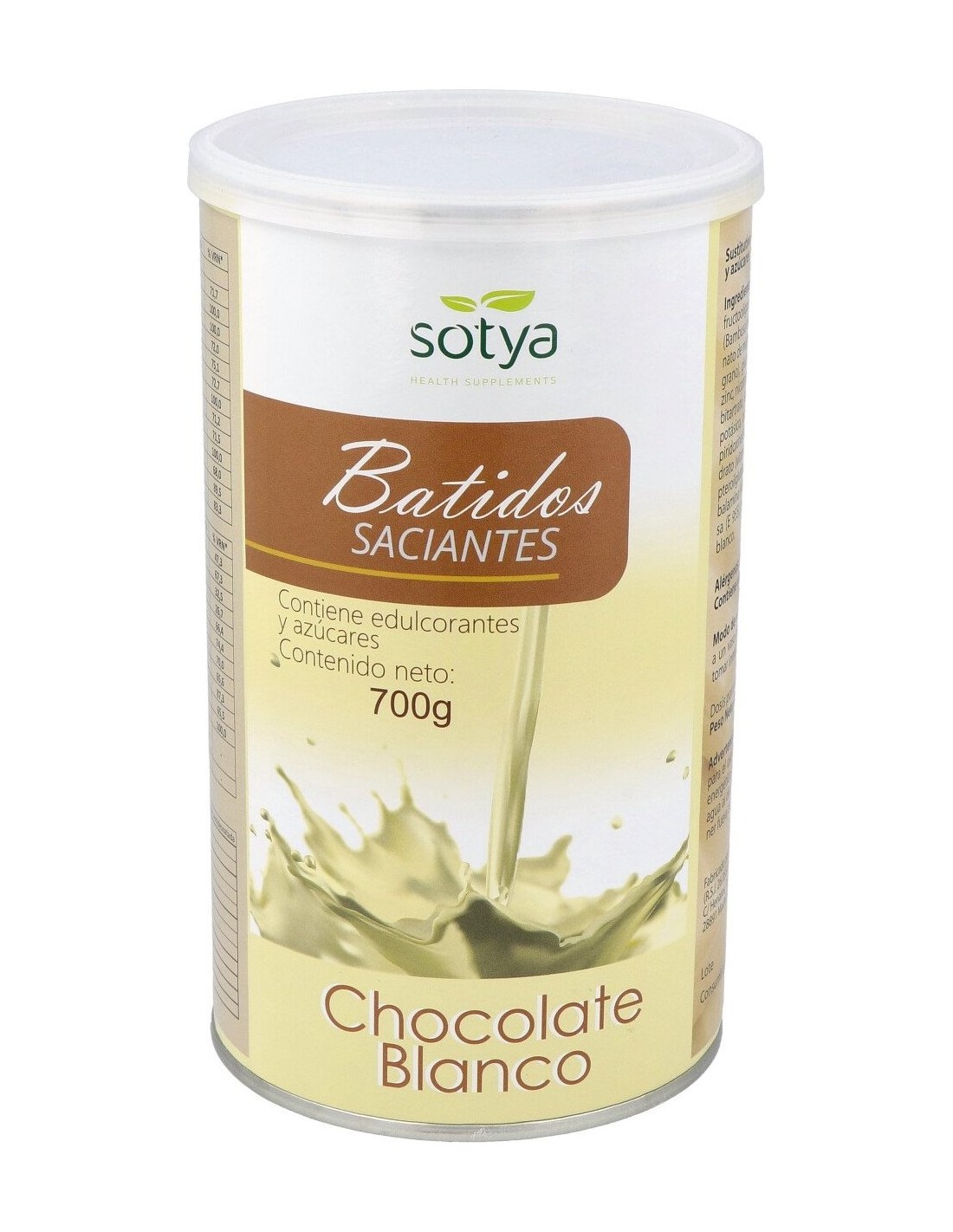 Leche desnatada en polvo, fructosa, proteínas lácteas (leche), fructooligosacáridos (fibra de achicoria), maltodextrina, fibra de bambú (Bambusa bambos (L.) Voss, tallo), espesante: goma xantana (E415), carbonato de magnesio, citrato potásico, extracto Café verde (Coffea arabica L., grano), gluconato de hierro, ácido L-ascórbico (vitamina C), gluconato de zinc, nicotinamida (vitamina B3), D-pantotenato cálcico (vitamina B5), colina bitartrato, inositol, citrato potásico, gluconato de cobre, gluconato de manganeso, yoduro potásico, picolinato de cromo, acetato de D-alfa tocoferilo (vitamina E), piridoxina clorhidrato (vitamina B6), riboflavina (vitamina B2), tiamina clorhidrato (vitamina B1), acetato de retinilo (vitamina A), selenito sódico, ácido pteroilglutámico (ácido fólico), filoquinona (vitamina K), D-biotina, cianocobalamina (vitamina B12) y colecalciferol (vitamina D3). Edulcorante: sucralosa (E955). Colorante Betacaroteno (E160). Aroma natural de chocolate blanco.