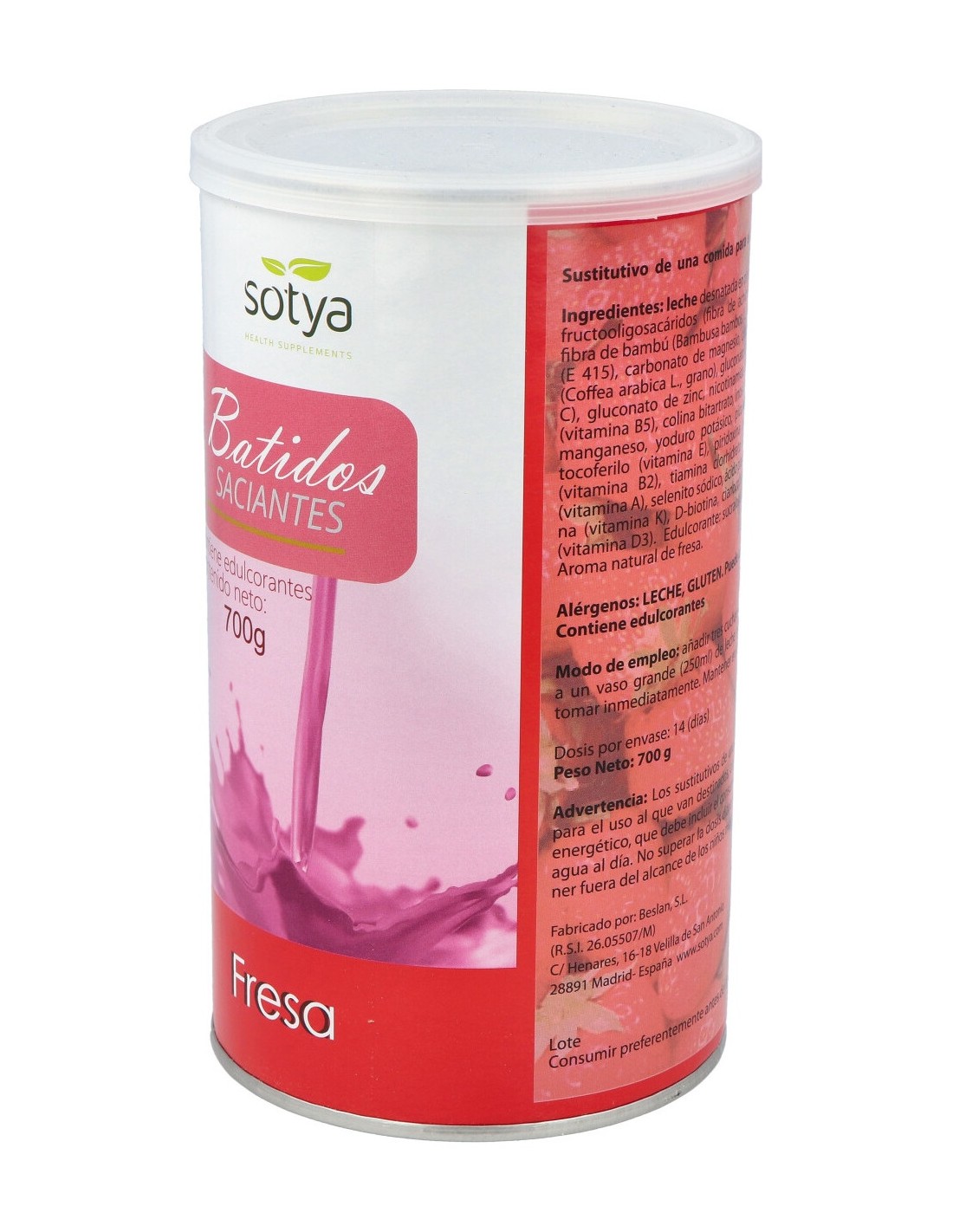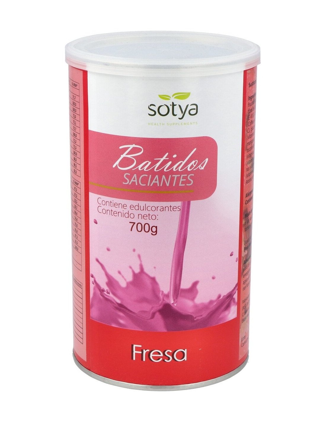 Leche desnatada en polvo, fructosa, proteínas lácteas (leche), fructooligosacáridos (fibra de achicoria), maltodextrina, fresa liofilizada, fibra de bambú (Bambusa bambos (L.) Voss, tallo), espesante: goma xantana (E415), carbonato de magnesio, citrato potásico, extracto café verde (Coffea arabica L., grano), gluconato de hierro, ácido L-ascórbico (vitamina C), gluconato de zinc, nicotinamida (vitamina B3), D-pantotenato cálcico (vitamina B5), colina bitartrato, inositol, gluconato de cobre, gluconato de manganeso, yoduro potásico, picolinato de cromo, acetato de D-alfa tocoferilo (vitamina E), piridoxina clorhidrato (vitamina B6), riboflavina (vitamina B2), tiamina clorhidrato (vitamina B1), Acetato de retinilo (vitamina A), selenito sódico, ácido pteroilglutámico (ácido fólico), filoquinona (vitamina K), D-biotina, cianocobalamina (vitamina B12) y colecalciferol (vitamina D3). Edulcorante: sucralosa (E955). Colorante: remolacha (E162). Aroma natural de fresa.