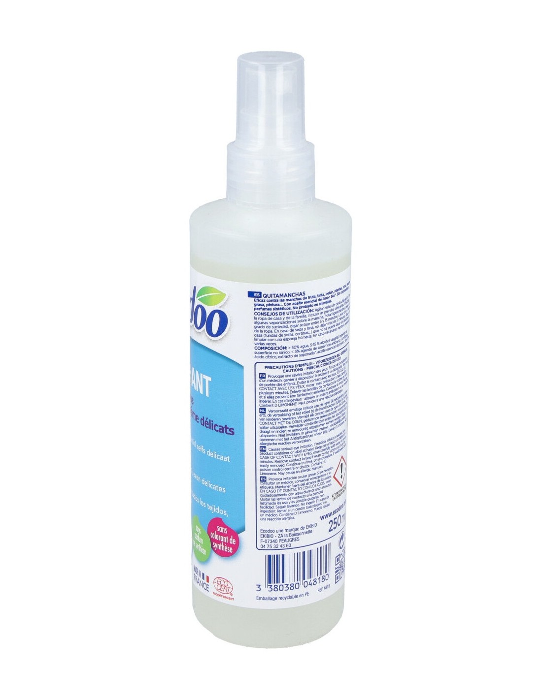 Para las manchas de todos los tejidos, incluidos los delicados. Sin perfumes ni colorantes de síntesis. Eficaz contra las manchas de fruta, verdura, vino, sangre, pintura, tinta, betún, etc.
