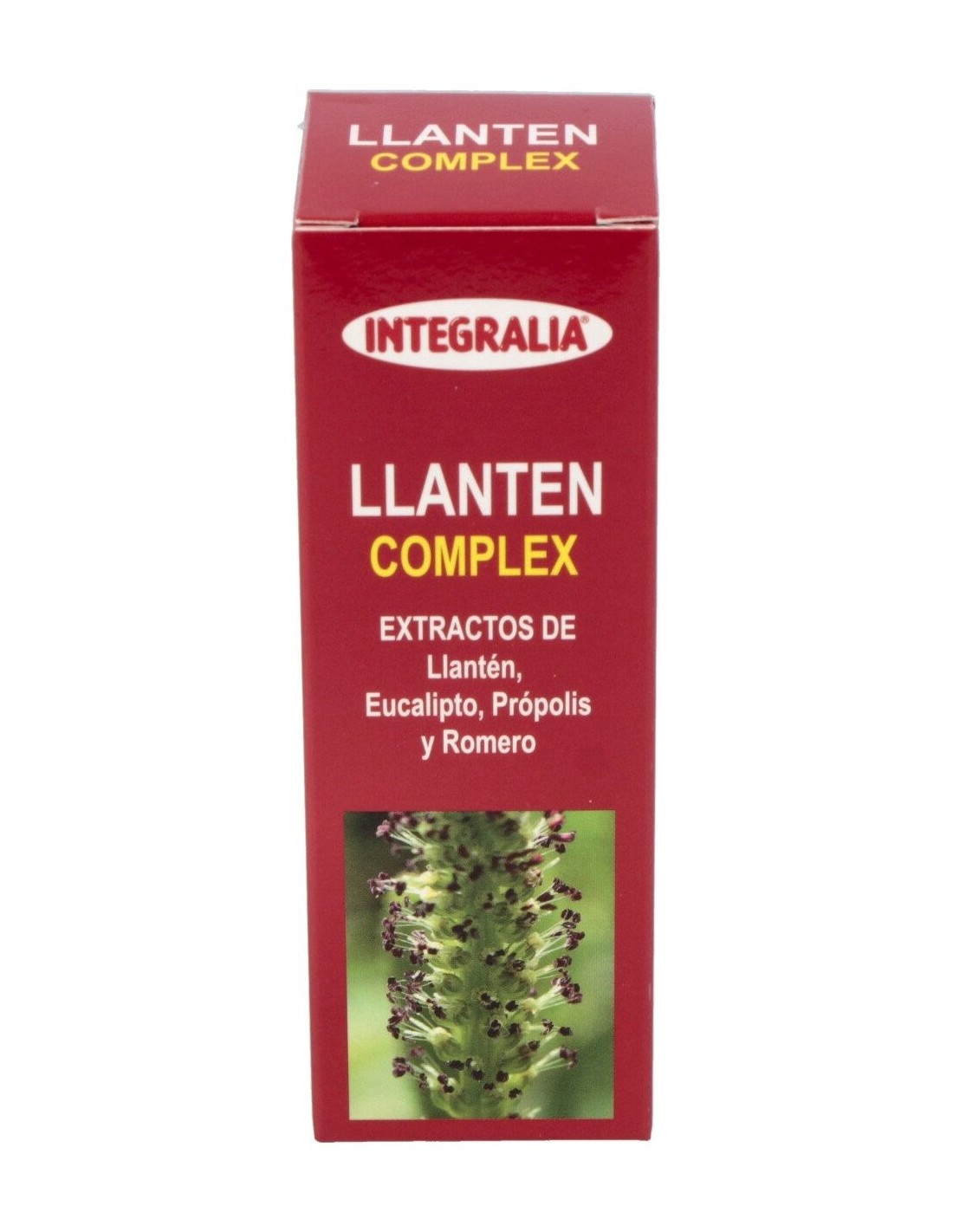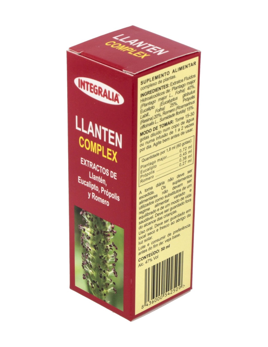 Ext. Llanten comprimidoslex 50ml de Integralia es una solución que se utiliza en casos de congestión gracias a su capacidad descongestionante y mucolítica. Está formado a base de plantas de Llantén, Eucalipto, Própolis, Equinacea y Romero, las cuales son muy eficientes de tomar. Se recomienda en casos de catarro, faringitis, asma o bronquitis. Hasta el momento no se ha presentado ninguna contraindicación. Conviene consultar con un especialista en caso de sufrir alergia a alguno de sus ingredientes o en caso de hipersensibilidad. También hay que acudir al especialista en caso de estar tomando alguna medicación con la finalidad de evitar efectos adversos. No hay que exceder la dosis diaria recomendada. No apto para mujeres embarazadas o en periodo de lactancia. Este suplemento alimenticio no sustituye una dieta variada y equilibrada.