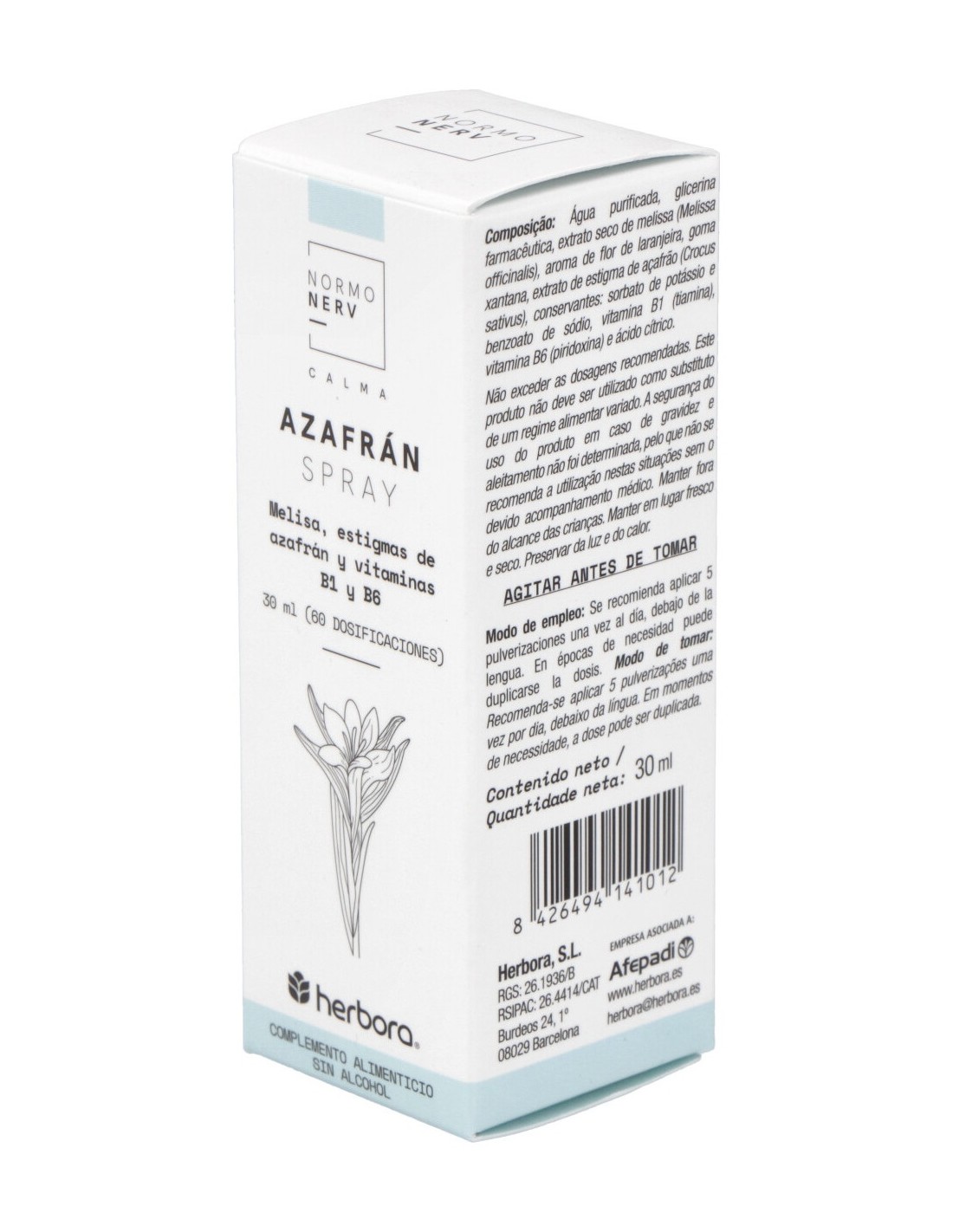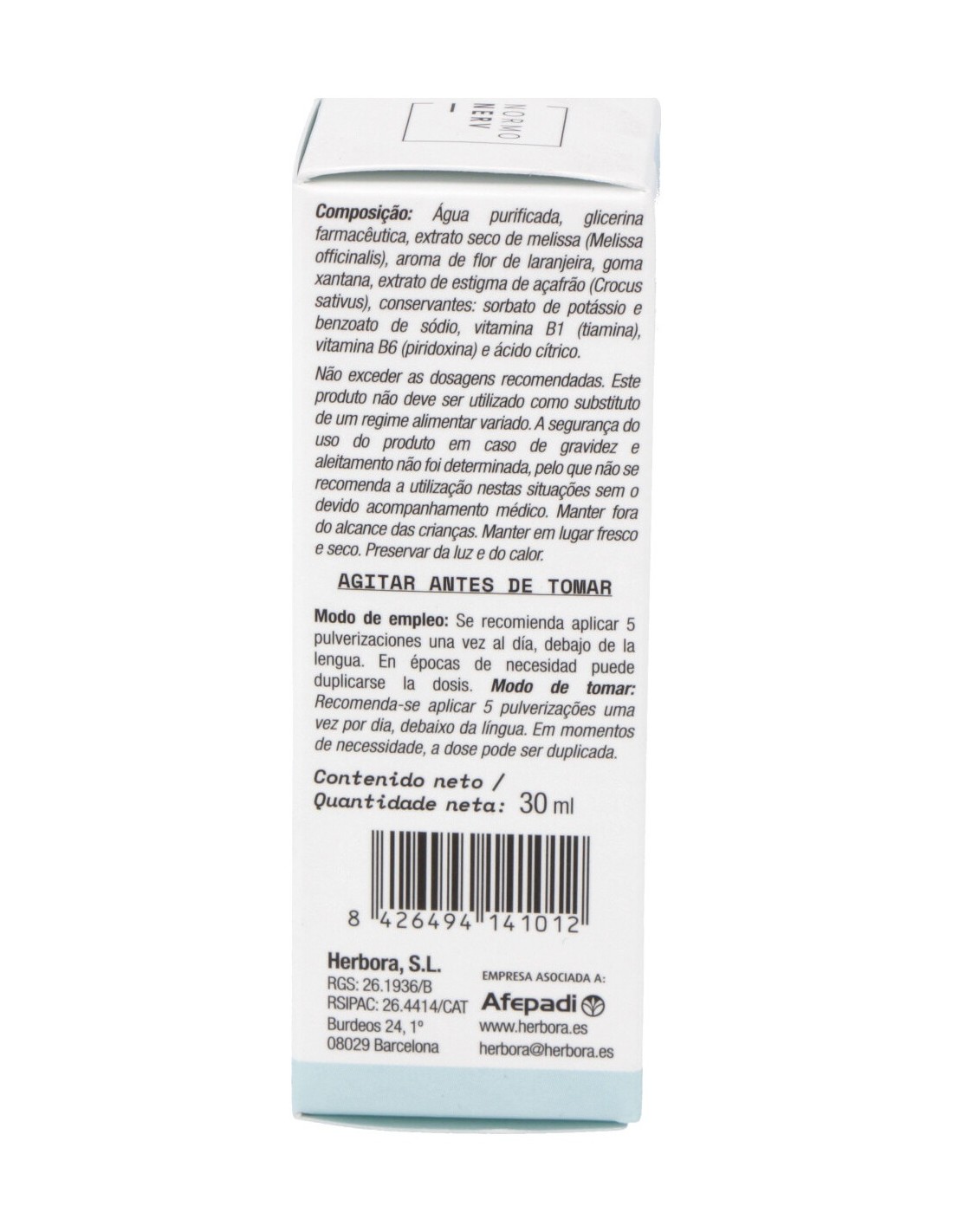 Complemento alimenticio en formato spray, elaborado a base estigmas de azafrán, melisa y vitaminas B1 y B6. Especialmente indicado para contribuir al funcionamiento normal del sistema nervioso y de la función psicológica.