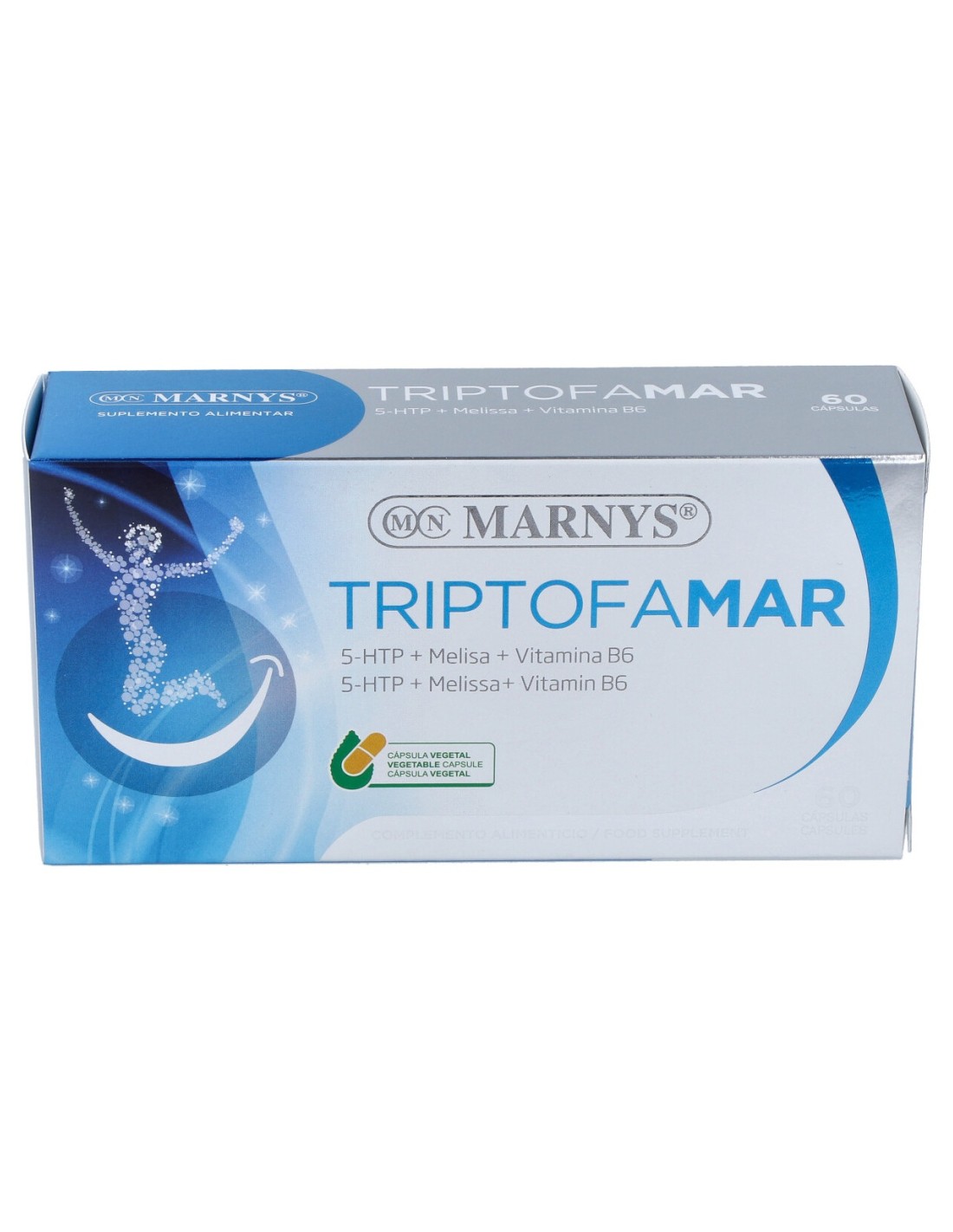 Concentrado en polvo de hojas de melisa (Mellisa officinalis), L-5-Hidroxitriptofano del concentrado en polvo de semilla de la Griffonia simplicifolia, pirididoxina clorhidrato (vitamina B6), antiaglomerantes (estearato de magnesio, dióxido de silicio) y estabilizante (celulosa microcristalina). *Vitamina B6 contribuye a la reducción de la fatiga y cansancio.