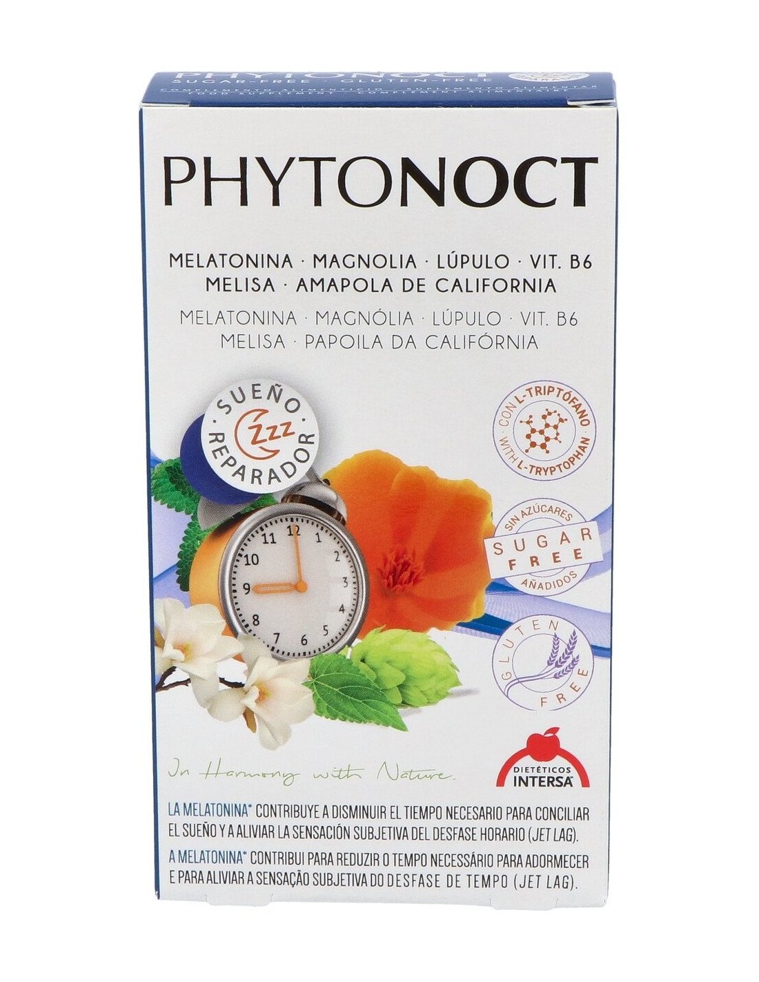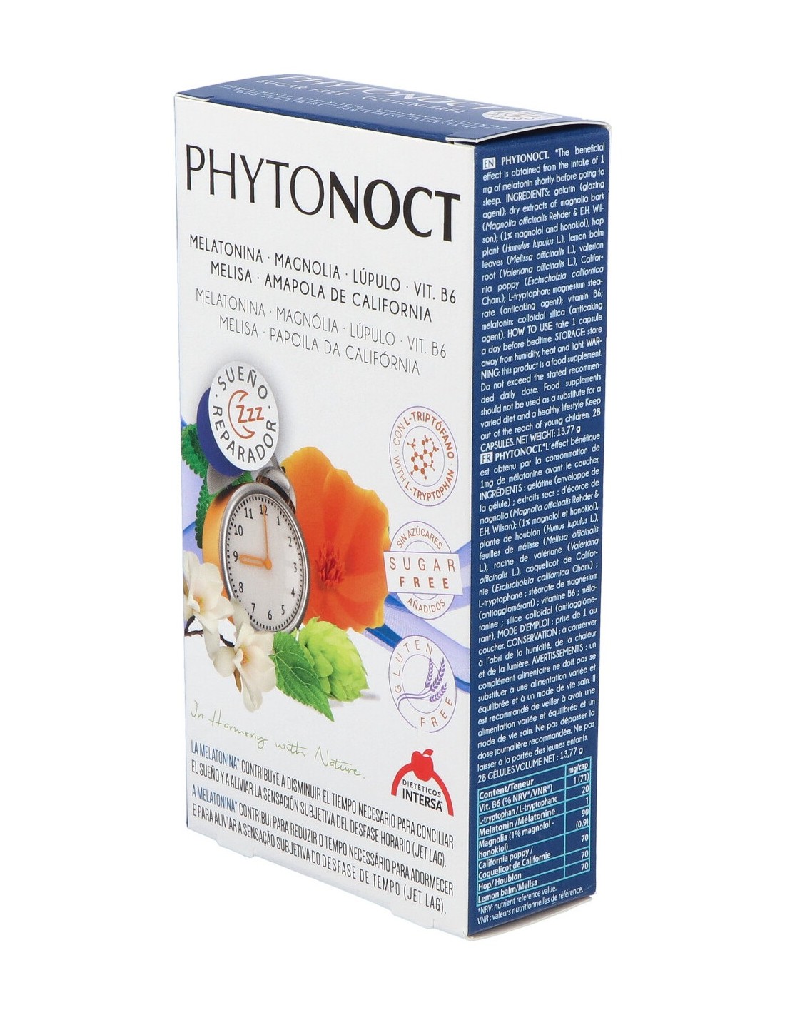 Extracto de magnolia (90 mg), Extracto de amapola de California (70 mg), Triptófano (20 mg), Melatonina (1 mg), Vitamina B6 (1 mg), Magnolia officinalis;, Extracto seco de planta de lúpulo, Extracto seco de corteza de magnolia, Extracto seco de hojas de melisa, Extracto seco de Amapola de California, L-Triptófano, Extracto seco de raíz de valeriana, Vitamina B6 / piridoxina, Extracto de Valeriana, Sílice coloidal, Extracto de Lúpulo, L-Triptofano / Triptófano / Trp, Amapola Californiana / campanilla / dedal de oro, Gelatina, Extracto de melisa., Estearato de magnesio.