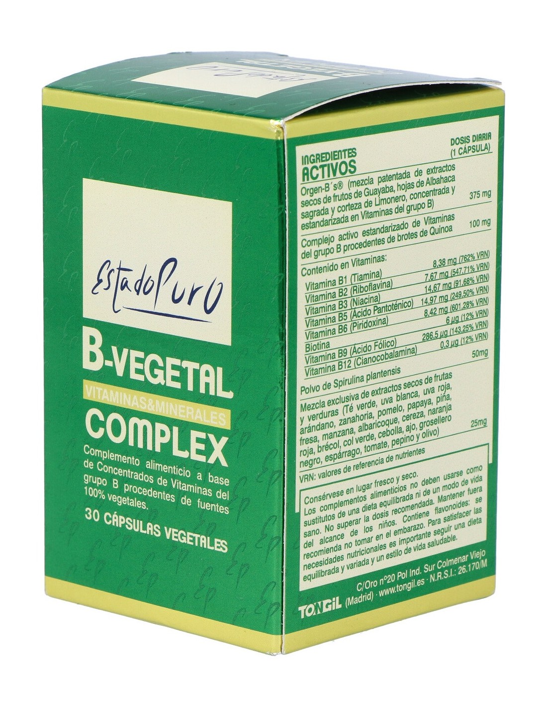 Orgen-B´s® (mezcla patentada de extractos secos de frutos de Guayaba, hojas de Albahaca sagrada y corteza de Limonero, concentrada y estandarizada en Vitaminas del grupo B)............................375 mg