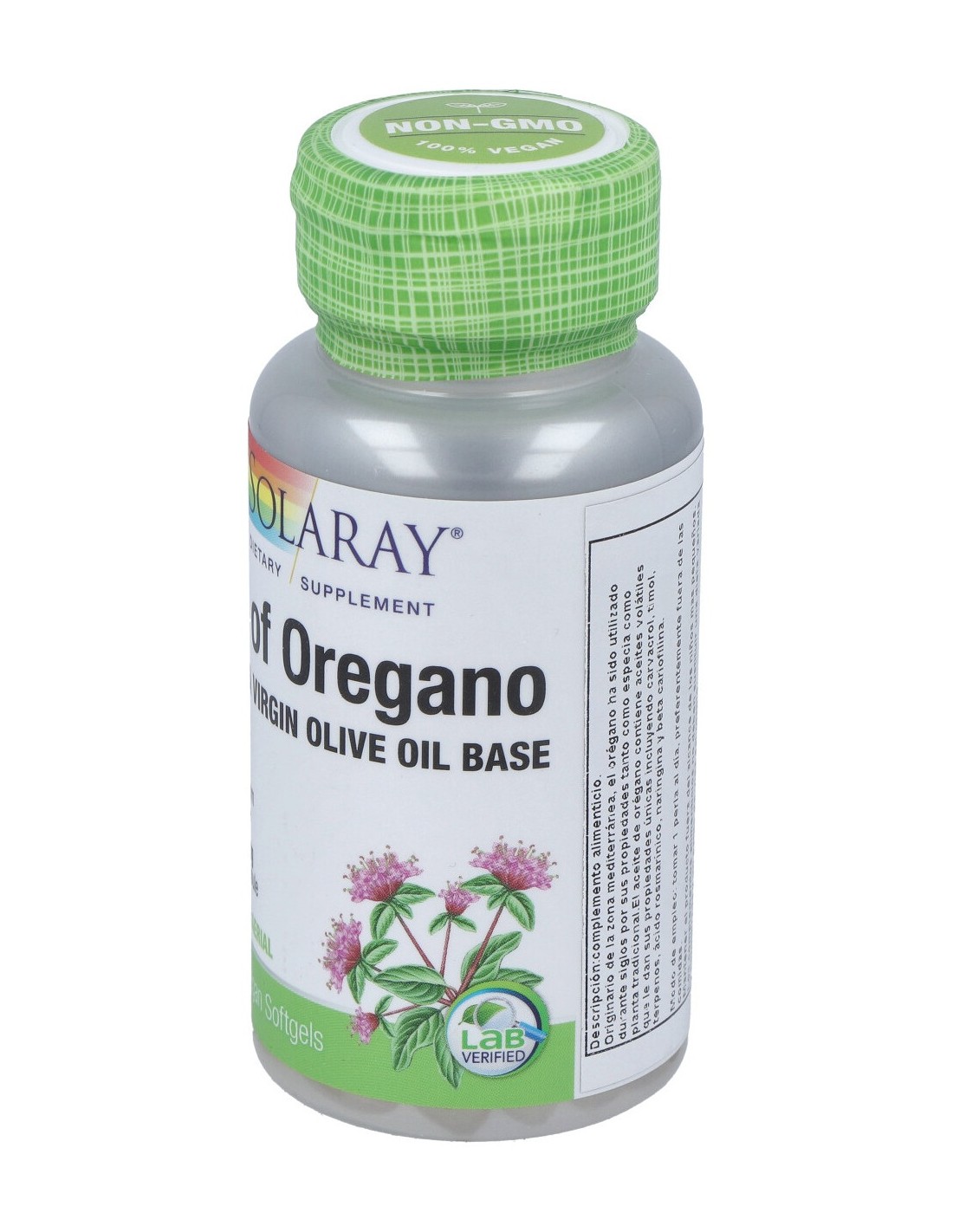 Extracto de aceite de orégano del Mediterráneo (Origanum vulgare)(parte aérea), base de aceite de oliva extra virgen:cápsula de gelatina y glicerina.