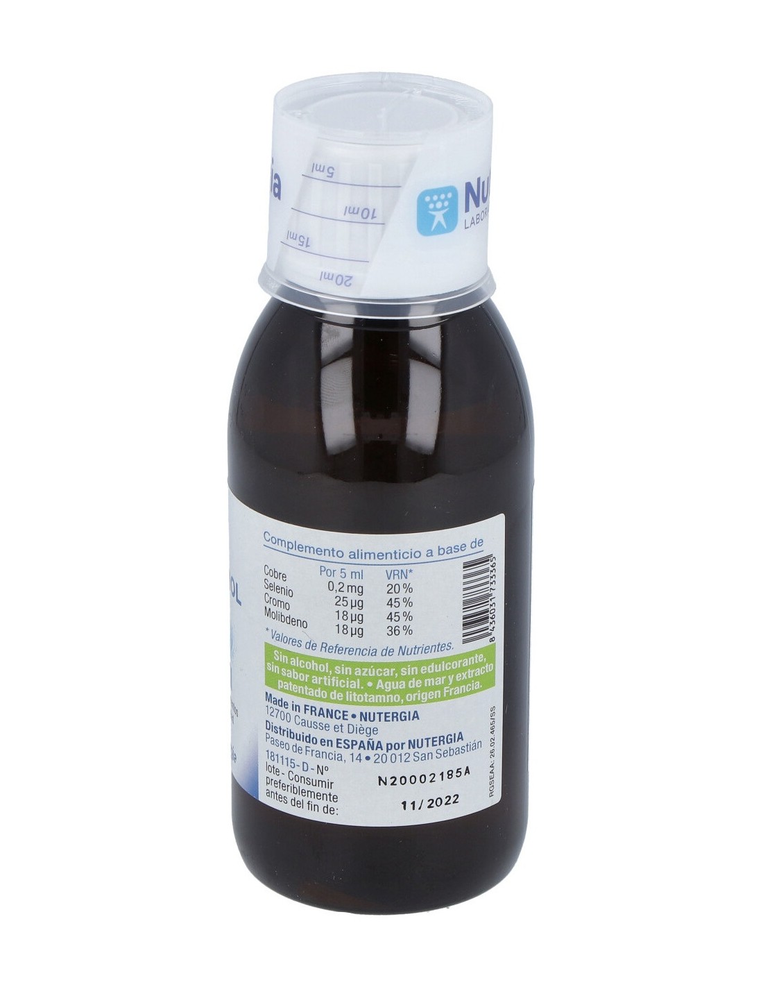 Solución acuosa de oligoelementos (agua filtrada, agua de mar concentrada sin sodio, Lithomer®: extracto estandarizado de litotamno – Lithothamnium calcareum; gluconatos de zinc, de hierro y de cobre, sulfato de manganeso, selenito y molibdato de sodio, cloruro de cromo). Conservante: sorbato de potasio, acidificante: ácido láctico.