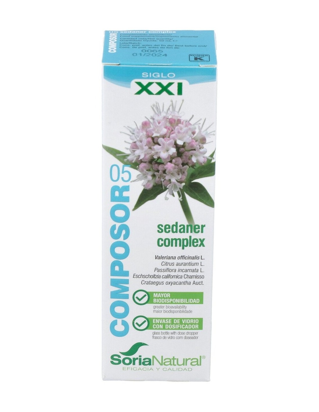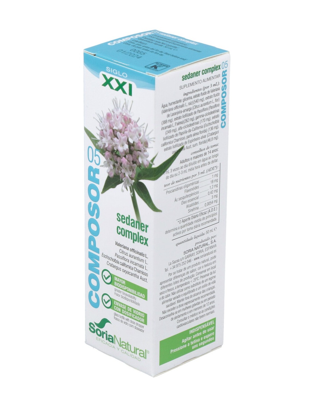 Agua, humectante: glicerina, extracto fluido de valeriana (Valeriana officinalis L., raíz)(540 mg), extracto fluido de azahar (Citrus aurantium L., flor) (388 mg), extracto liofilizado de pasiflora (Passiflora incarnata L., p. aérea) (262 mg), gamma ciclodextrinas (249 mg), alfa-ciclodextrinas (170 mg), extracto liofilizado de amapola de california (Eschscholzia californica Chamisso, parte aérea florida) (136 mg), extracto liofilizado de espino blanco (Crataegus oxyacantha L., sum. florida) (46,8 mg).