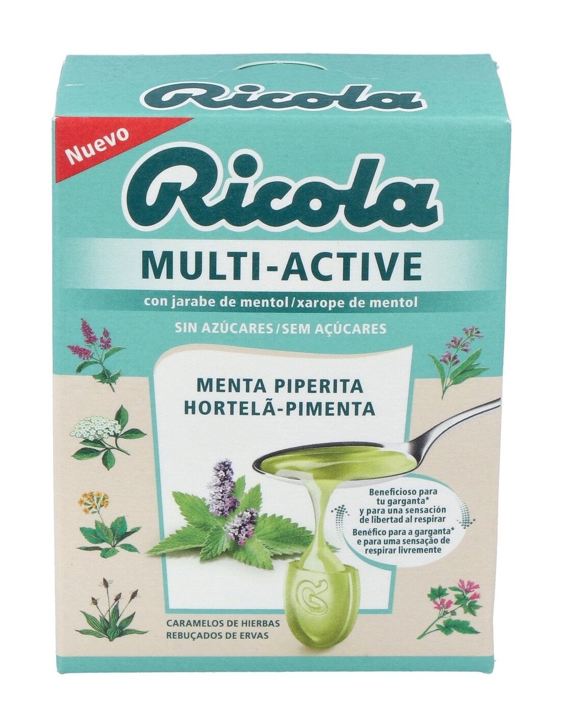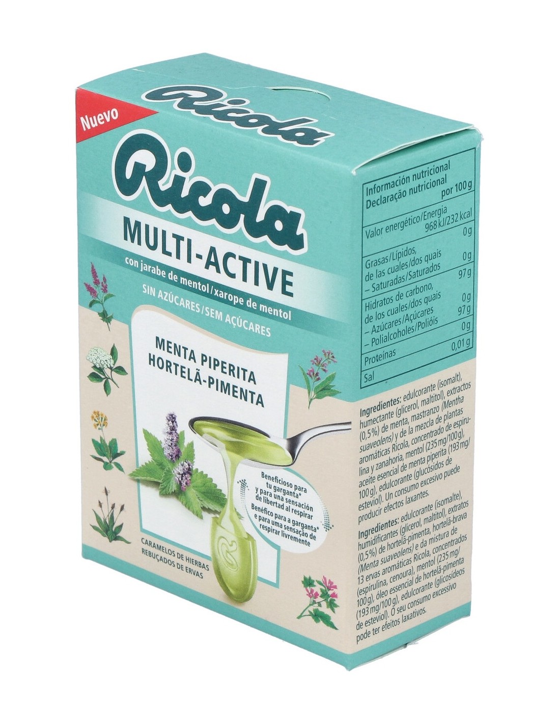 Edulcorante (isomalt), humectante (glicerol, maltitol), extractos (0,5%) de menta, mastranzo (Mentha suaveolens) y de la mezcla de plantas aromáticas Ricola, concentrado de espiru-lina y zanahoria, mentol (235 mg/100 g), aceite esencial de menta piperita (193 mg/ 100 g), edulcorante (glucósidos de esteviol).
