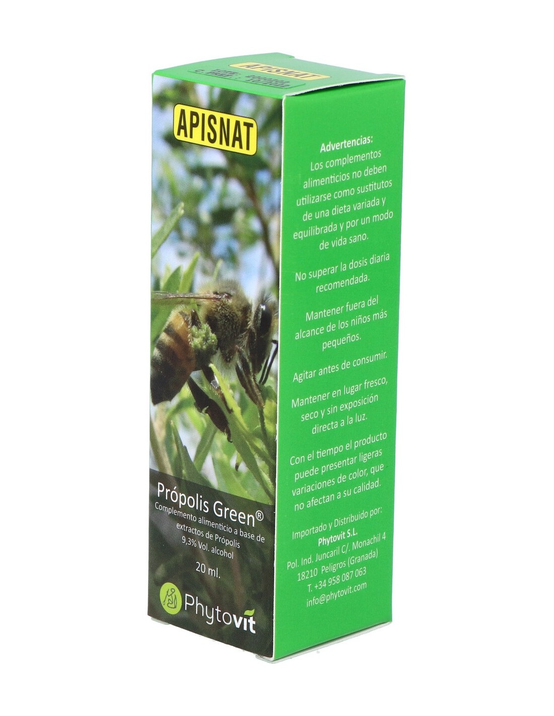 Complemento alimenticio en formato líquido, elaborado a base de própolis verde, que contribuye a prevenir afecciones del sistema circulatorio y a reforzar el sistema inmunitario. Favorece además unos niveles saludables de azúcar en sangre, ayuda a regular la presión arterial y a suavizar la garganta en épocas de resfriados.