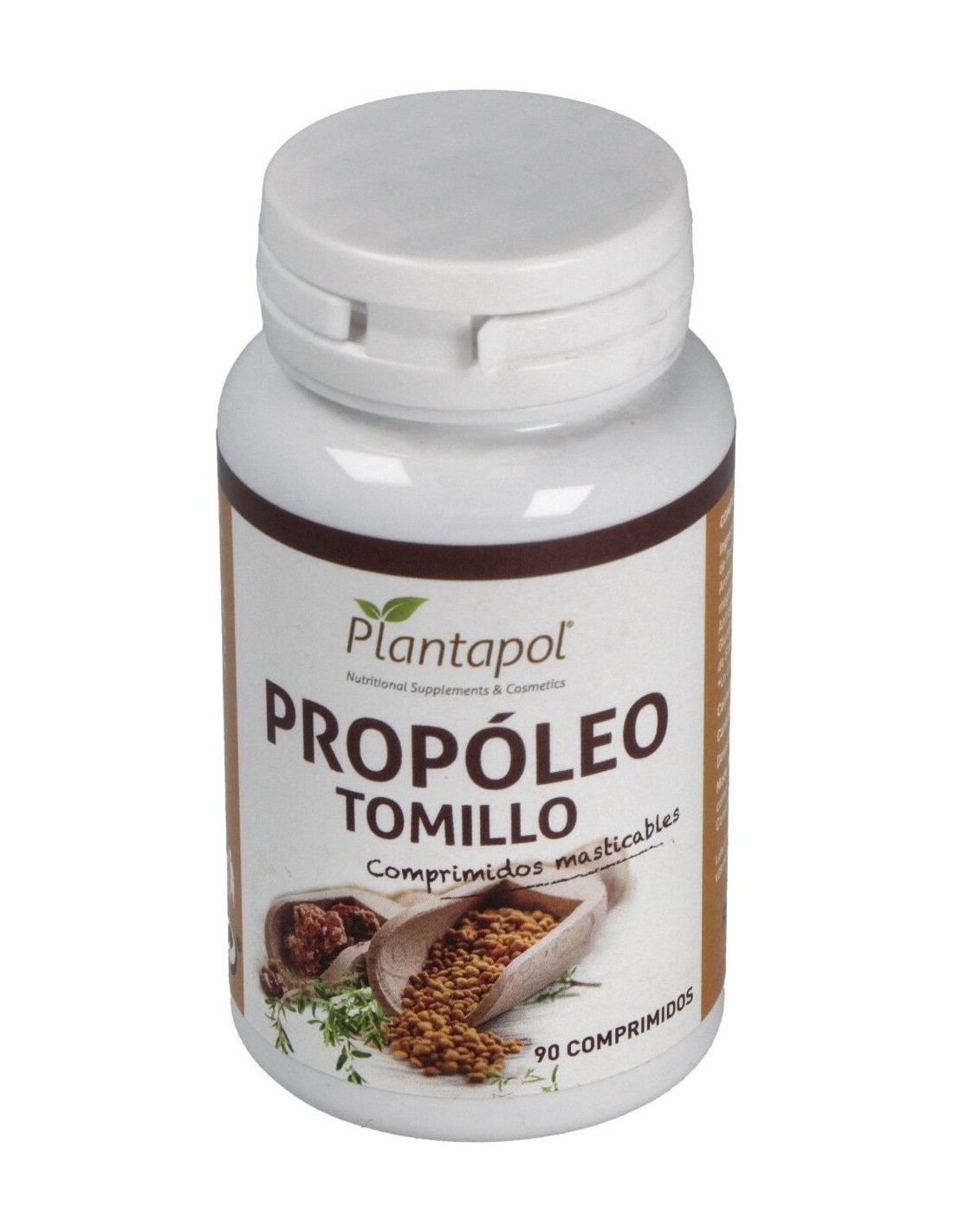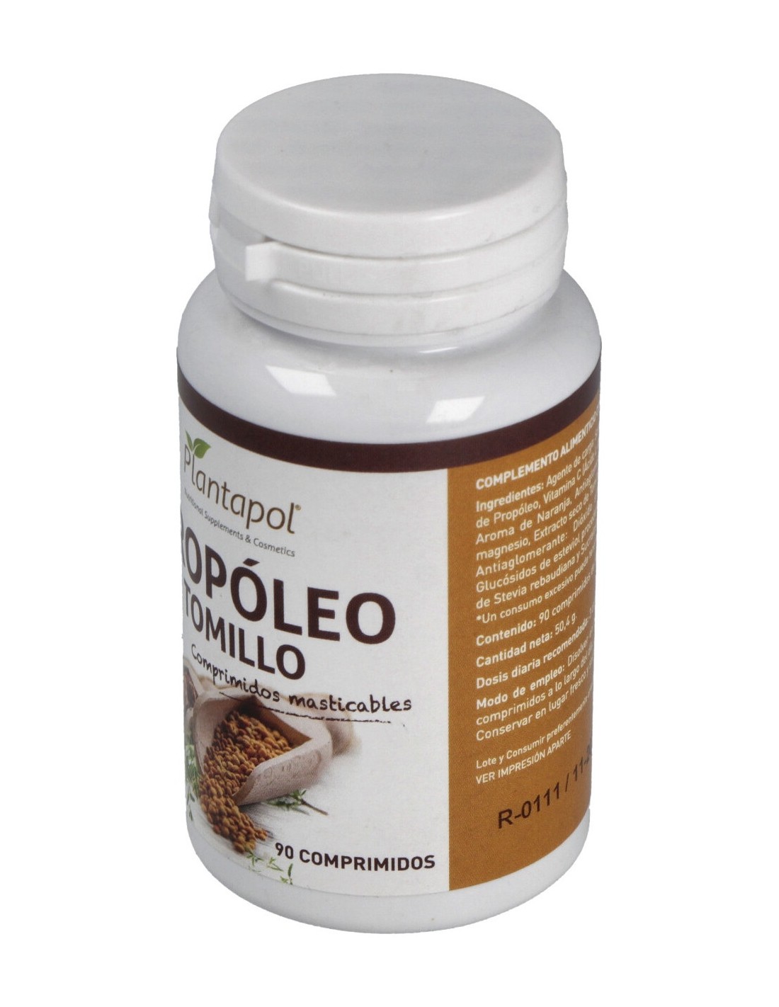 Extracto seco de Propóleo 240 mg, Vitamina C 180 mg, Extracto seco de Tomillo 30 mg. Sorbitol, Fructosa, Aroma de Naranja, Dióxido silicio, Estearato de magnesio, Extracto seco de Stevia rebaudiana E-960 y Sucralosa.