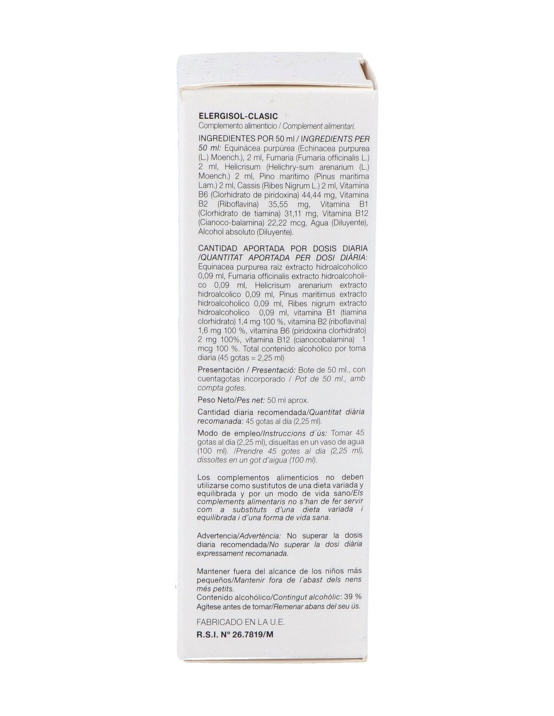 Equinácea (Echinacea Purpurea (L.) Moench. ), Fumaria (Fumaria Officinalis L.), Helichrysum (Helichrysum Arenarium (L.) Moench. ), Pino Marítimo (Pinus Maritima Lam. ), Cassis (Ribes Nigrum L.), Vitamina B6 (Clorhidrato De Piridoxina), Vitamina B2 (Riboflavina), Vitamina B1 (Clorhidrato De Tiamina), Vitamina B12 (Cianocobalamina), Agua (Diluyente), Alcohol Absoluto (Diluyente).