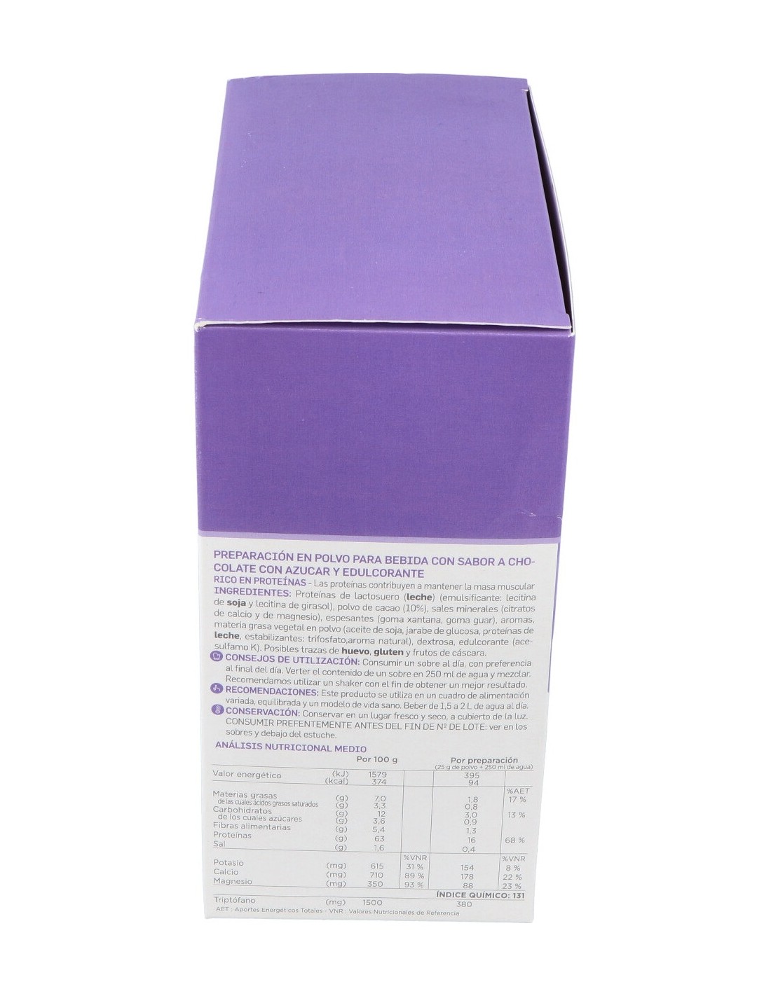 Proteínas de lactosuero (leche), lecitina de soja, lecitina de girasol, polvo de cacao (10%), sales minerales (citratos de calcio y de magnesio), goma xantana, goma guar, aromas, materia grasa vegetal en polvo (aceite de soja, jarabe de glucosa, proteínas de leche, estabilizantes: trifosfato, aroma natural), dextrosa, edulcorante (acesulfamo K).